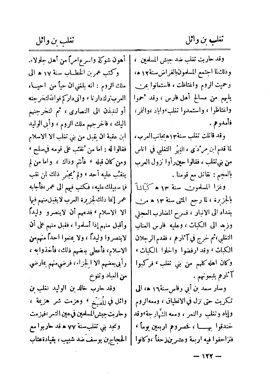 وقد حارب خالد بن الوليد تغلب بن وائل في للصيّخ، وهزمت شر هزيمة، وحاربت جيش المسلمين في عين التمر، فهزمت ونجد بني تغلب سنة 77 هـ قد حاربوا مع الحجاج بن يوسف ضد شبيب، بقيادة عتاب