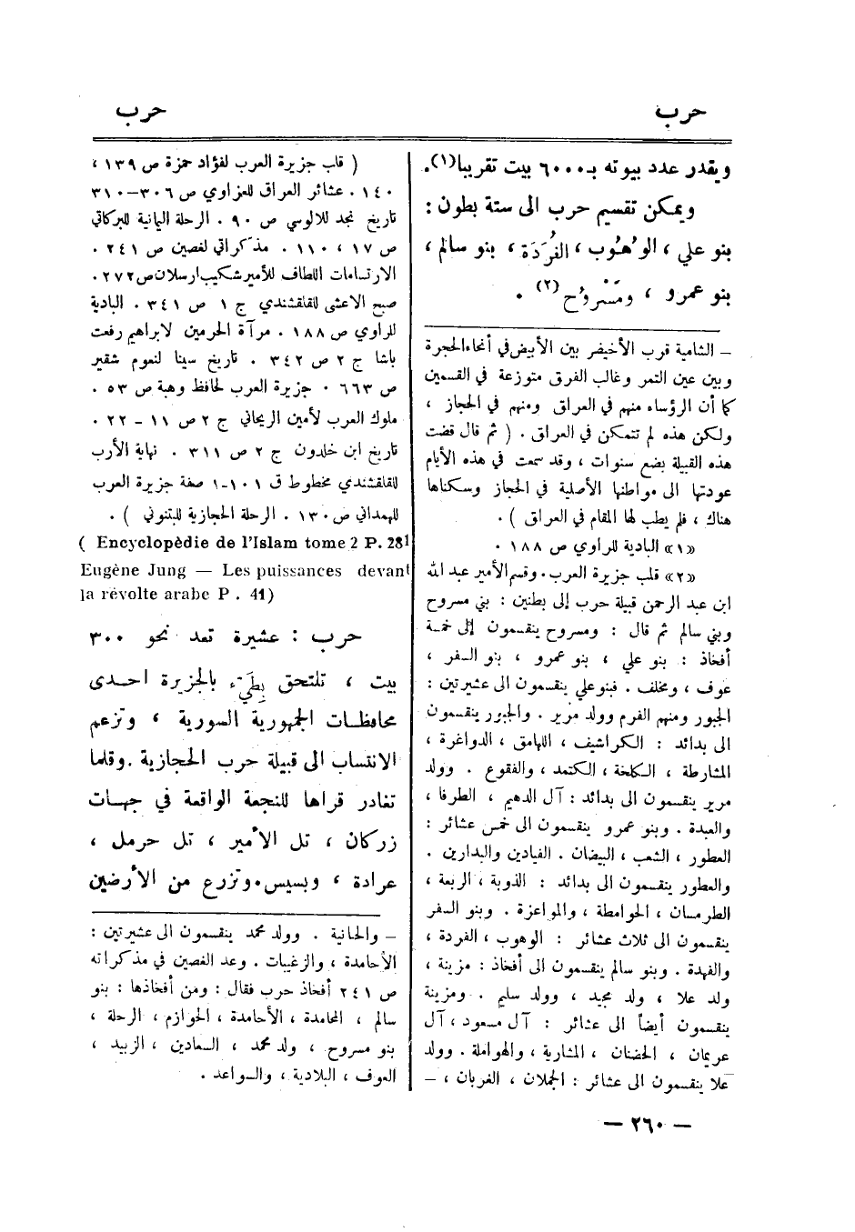 [2] قلب جزيرة العرب. وقسم الأمير عبد الله ابن عبد الرحمن قبيلة حرب إلى بطنين: بني مسروح وبني سالم ثم قال: ومسروح ينقسمون إلى خمسة أفخاذ: بنو علي، بنو عمرو، بنو السفر، عوف، ومخلف. فبنو علي ينقسمون الى عشيرتين: