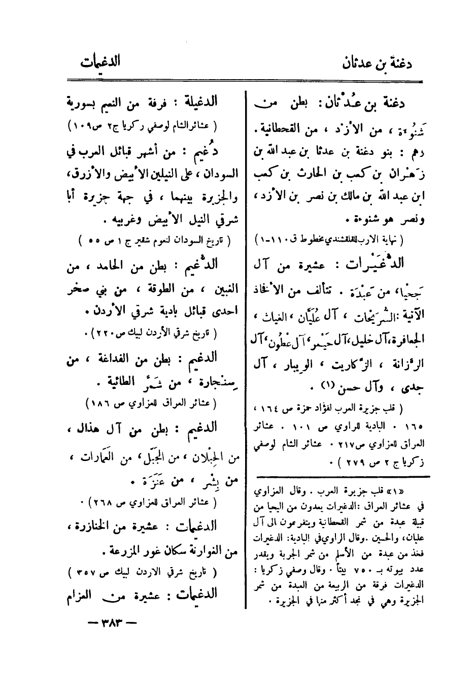[1] قلب جزيرة العرب. وقال العزاوي في عشائر العراق: الدغيرات يعدون من اليحيا من قبيلة عبدة من شمر القحطانية ويتفرعون الى آل عليان، والحسين. وقال الراوي في البادية: الدغيرات فخذ من عبدة من الأسلم من شمر الجربة ويقدر عدد بيوته ب 750 بيتا. وقال وصفي زكريا: