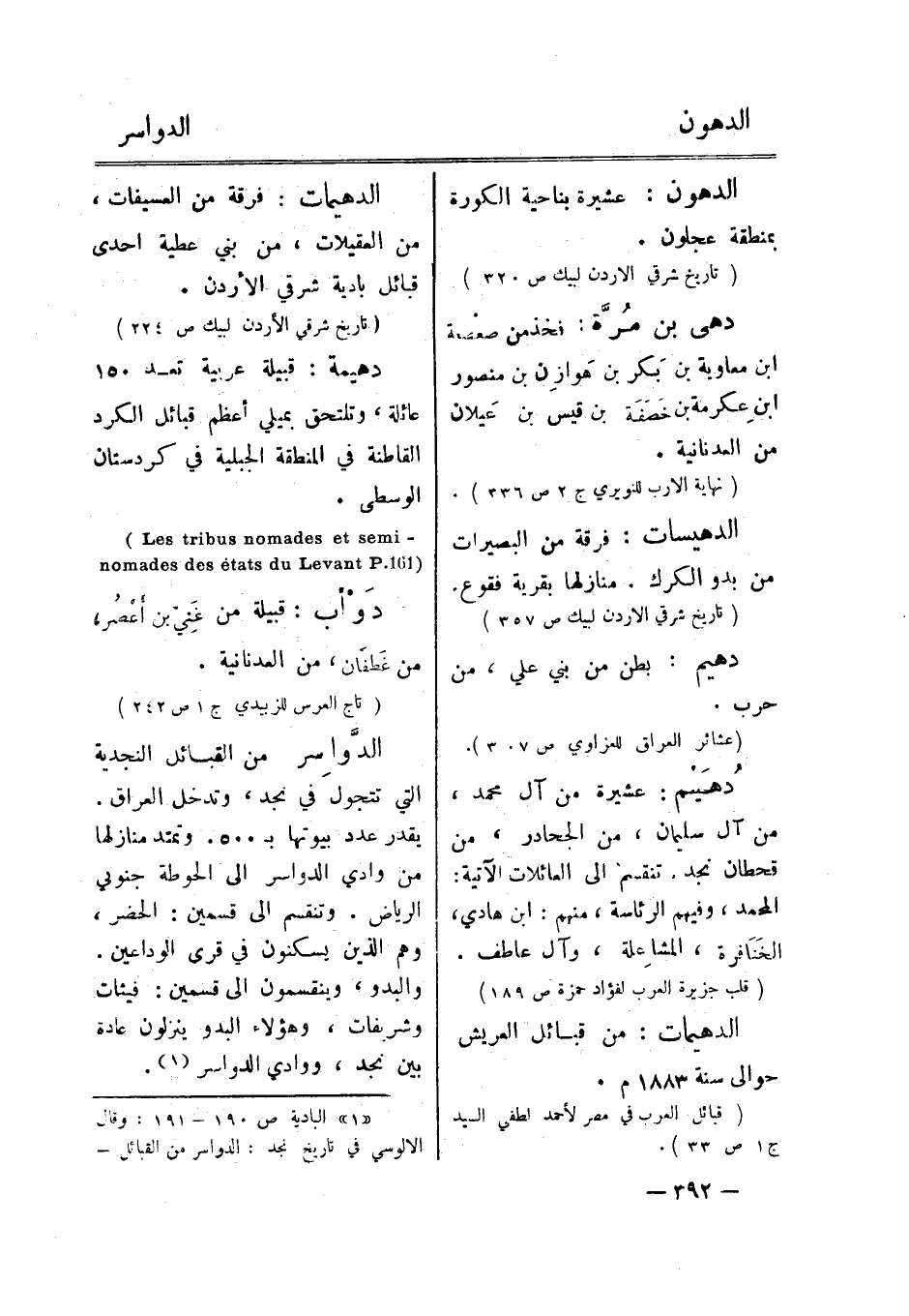[1] البادية ص 190- 191: وقال الالوسي في تاريخ نجد: الدواسر من القبائل الساكنة بنجد وهم حاضرة وبادية وسكنة البادية المساعرة وآل أبي سباع وآل بريدة وآل المازيم والمرجبان والخبيلات والشوافا والغياثات وآل أبي حازم وآل عمار.
