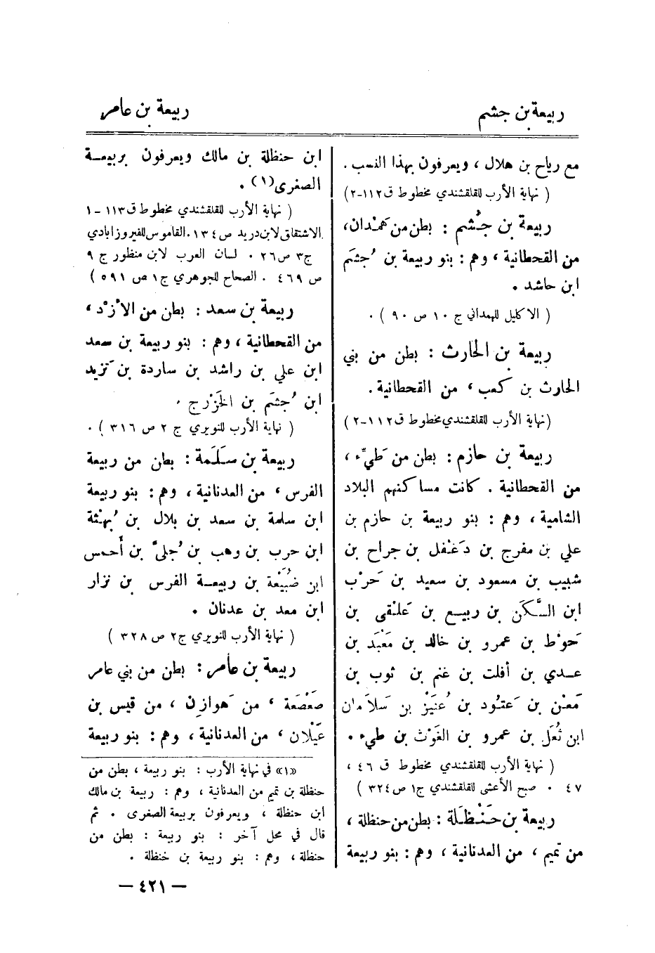 [1] في نهاية الأرب: بنو ربيعة، بطن من حنظلة بن تميم من العدنانية، وهم: ربيعة بن مالك ابن حنظلة، ويعرفون بربيعة الصغرى. ثم قال في محل آخر: بنو ربيعة: بطن من حنظلة، وهم: بنو ربيعة بن حنظلة.