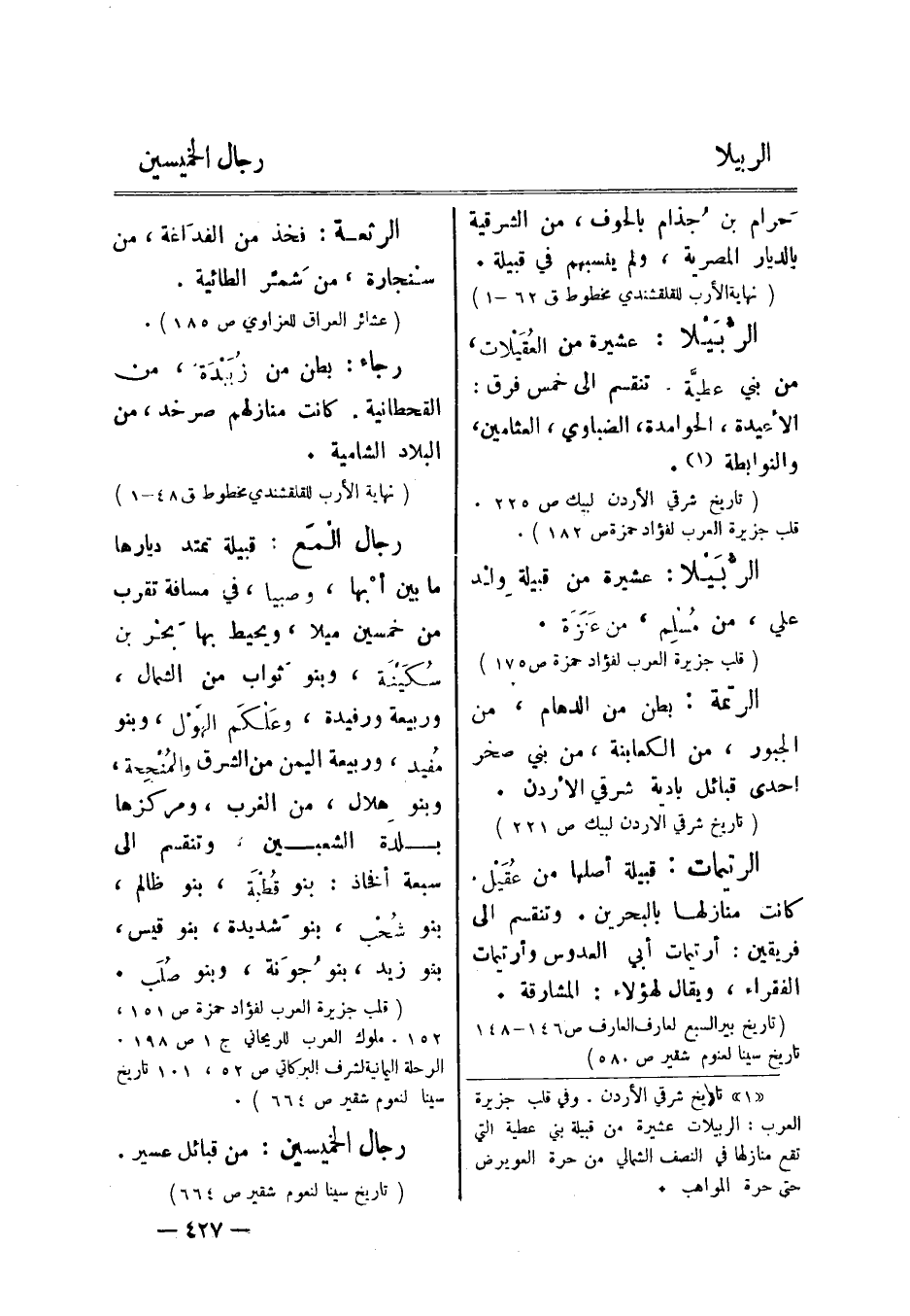 [1] تاريخ شرقي الأردن. وفي قلب جزيرة العرب: الربيلات عشيرة من قبيلة بني عطية التي تقع منازلها في النصف الشمالي من حرة العويرض حتّى حرة المواهب.