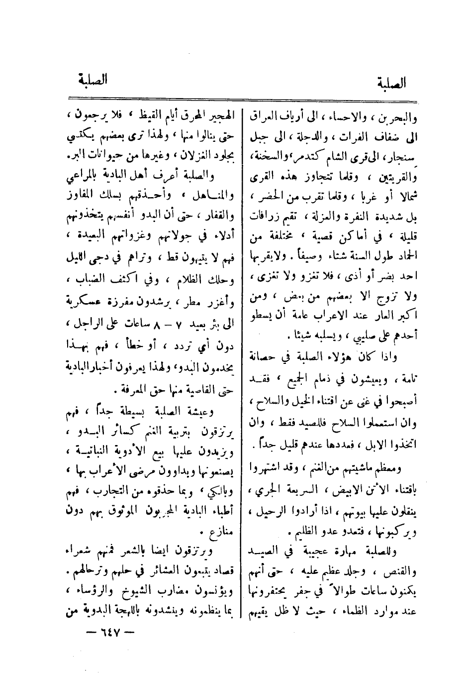والصلبة أعرف أهل البادية بالمراعي والمناهل، وأحذقهم بسلك المفاوز والقفار، حتى أن البدو أنفسهم يتخذونهم أدلاء في جولانهم وغزواتهم البعيدة، فهم لا يتيهون قط، وتراهم في دجى الليل وحلك الظلام، وفي اكثف الضباب، وأغزر مطر، يرشدون مفرزة عسكرية الى بئر بعيد 7- 8 ساعات على الراجل، دون أي تردد، أو خطأ، فهم بهذا يخدمون البدو، ولهذا يعرفون أخبار البادية حتى القاصية منها حق المعرفة.