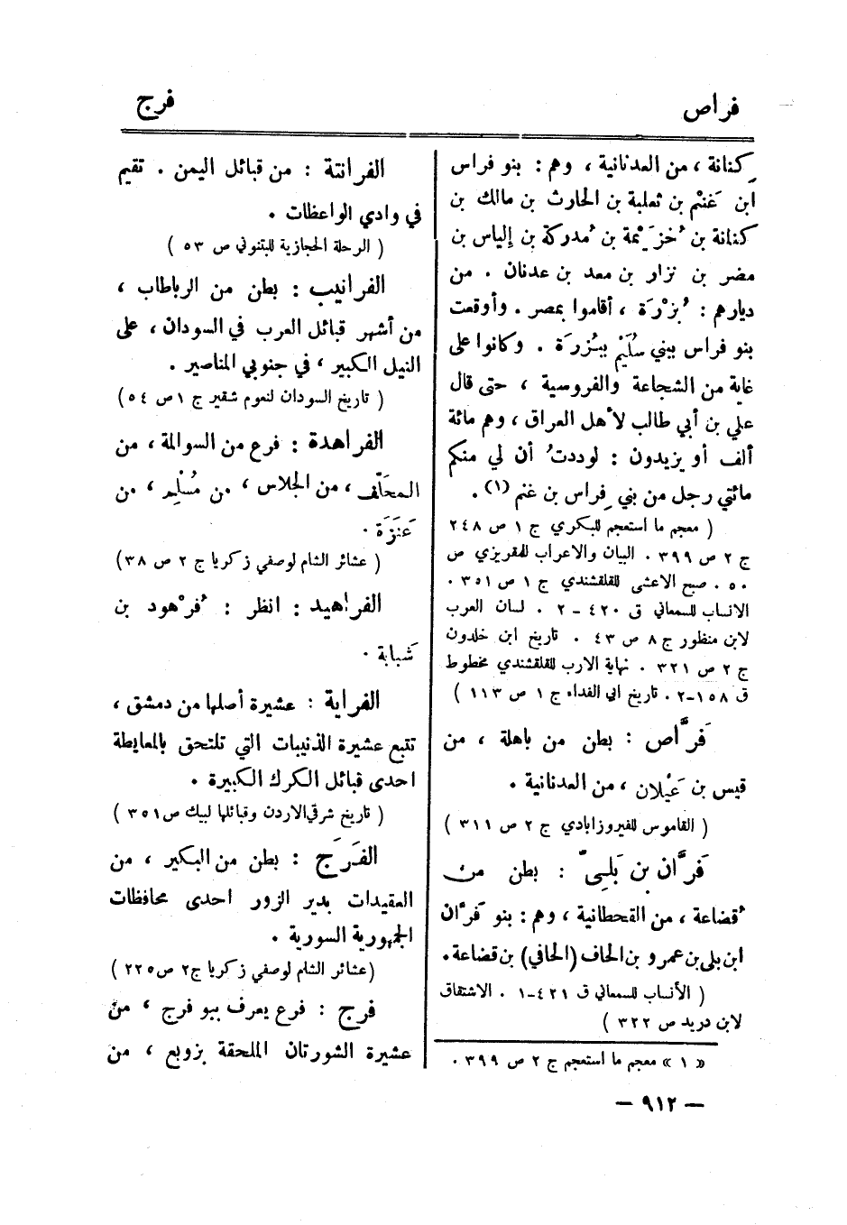 كنانة، من العدنانية، وهم: بنو فراس ابن غنم بن ثعلبة بن الحارث بن مالك بن كنانة بن خزيمة بن مدركة بن إلياس بن مضر بن نزار بن معد بن عدنان. من ديارهم: بزرة، أقاموا بمصر. وأوقعت بنو فراس ببني سليم ببزرة. وكانوا على غاية من الشجاعة والفروسية، حتى قال علي بن أبي طالب لأهل العراق، وهم مائة ألف أو يزيدون: لوددت أن لي منكم مائتي رجل من بني فراس بن غنم [1] .