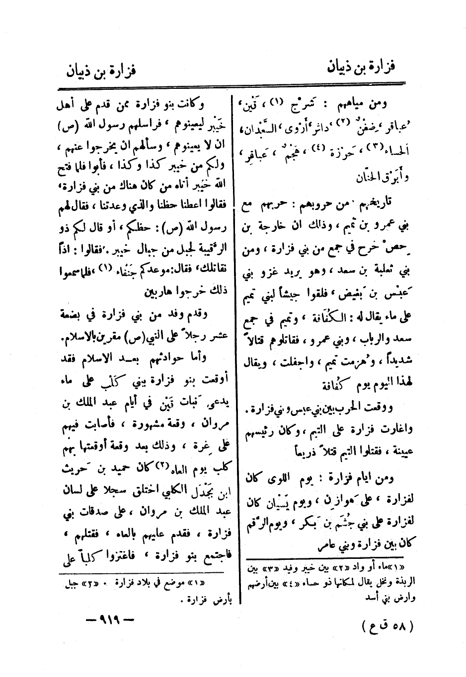 وأغارت فزارة على التيم، وكان رئيسهم عيينة، فقتلوا التيم قتلا ذريعا ومن ايام فزارة: يوم اللوى كان لفزارة، على هوازن، ويوم يسيان كان لفزارة على بني جشم بن بكر، ويوم الرّقم كان بين فزارة وبني عامر وكانت بنو فزارة ممن قدم على أهل خيبر ليعينوهم، فراسلهم رسول الله (ص) ان لا يعينوهم، وسألهم ان يخرجوا عنهم، ولكم من خيبر كذا وكذا، فأبوا فلما فتح الله خيبر أتاه من كان هناك من بني فزارة، فقالوا أعطنا حظنا والذي وعدتنا، فقال لهم رسول الله (ص) : حظكم، أو قال لكم ذو الرّقيبة لجبل من جبال خيبر. فقالوا: إذا نقاتلك، فقال: موعدكم جنفاء [5] ، فلما سمعوا ذلك خرجوا هاربين وقدم وفد من بني فزارة في بضعة عشر رجلا على النبي (ص) مقرين بالإسلام.