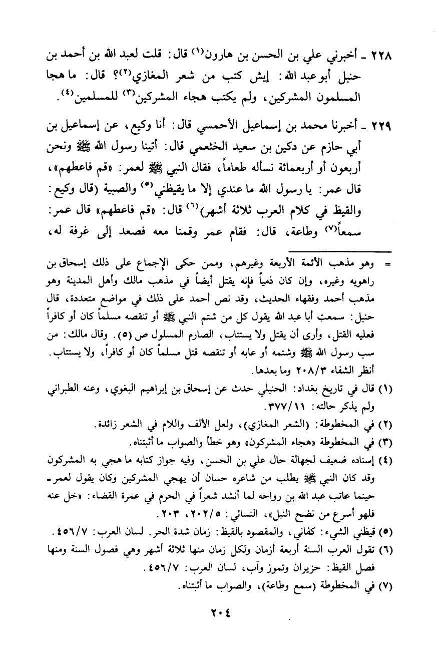 228 - أَخْبَرَنِي عَلِيُّ بْنُ الْحَسَنِ بْنِ هَارُونَ، قَالَ: قُلْتُ لِعَبْدِ اللَّهِ بْنِ أَحْمَدَ بْنِ حَنْبَلٍ: أَبُو عَبْدِ اللَّهِ إِيشْ §كَتَبَ مِنْ شِعْرِ الْمَغَازِي؟ قَالَ: مَا هَجَا الْمُسْلِمُونَ الْمُشْرِكِينَ، وَلَمْ يَكْتُبْ هِجَاءَ الْمُشْرِكِينَ لِلْمُسْلِمِينَ