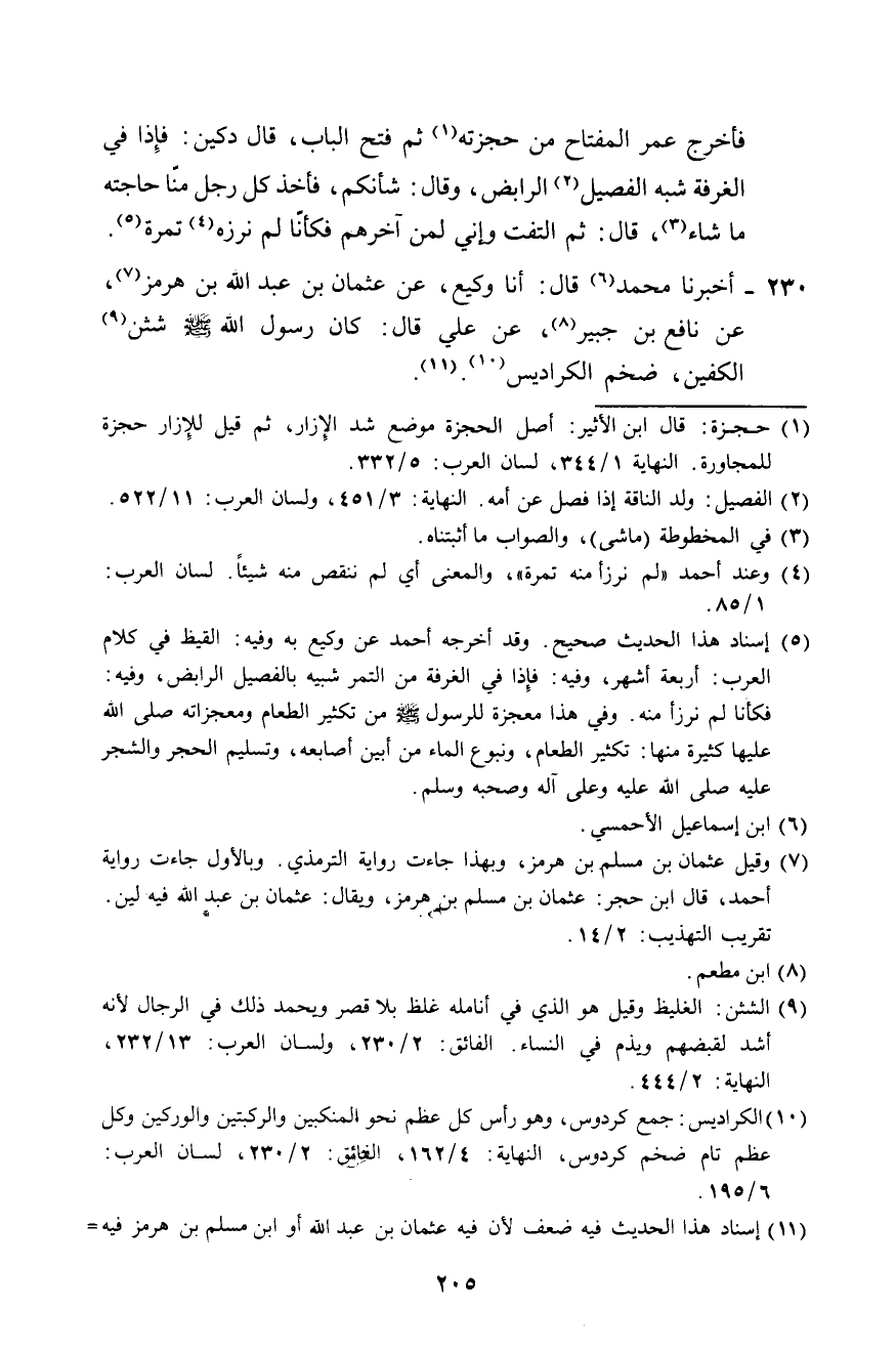 230 - أَخْبَرَنَا مُحَمَّدٌ، قَالَ: أَنَا وَكِيعٌ، عَنْ عُثْمَانَ بْنِ عَبْدِ اللَّهِ بْنِ هُرْمُزَ، عَنْ نَافِعِ بْنِ جُبَيْرٍ، عَنْ عَلِيٍّ، قَالَ: «§كَانَ رَسُولُ اللَّهِ صَلَّى اللهُ عَلَيْهِ وَسَلَّمَ شَثْنَ الْكَفَّيْنِ، ضَخْمَ الْكَرَادِيسِ»
