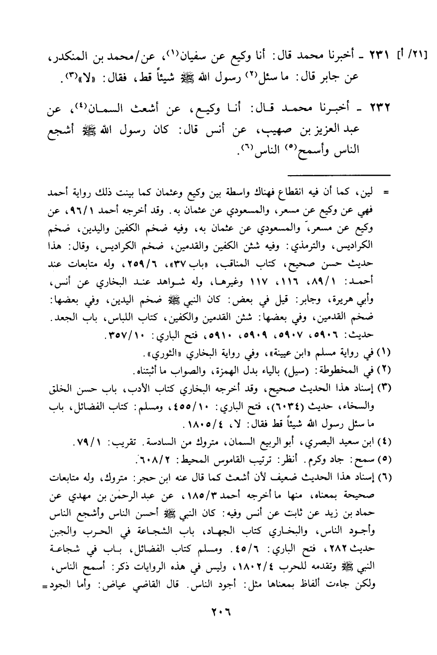 232 - أَخْبَرَنَا مُحَمَّدٌ، قَالَ: أَنَا وَكِيعٌ، عَنْ أَشْعَثَ السَّمَّانِ، عَنْ عَبْدِ الْعَزِيزِ بْنِ صُهَيْبٍ، عَنْ أَنَسٍ، قَالَ: «§كَانَ رَسُولُ اللَّهِ صَلَّى اللهُ عَلَيْهِ وَسَلَّمَ أَشْجَعَ النَّاسِ، وَأَسْمَحَ النَّاسِ»