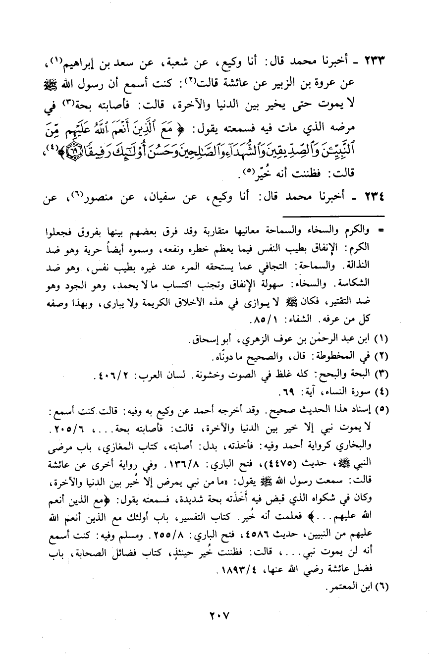 233 - أَخْبَرَنَا مُحَمَّدٌ، قَالَ: أَنَا وَكِيعٌ، عَنْ شُعْبَةَ، عَنْ سَعْدِ بْنِ إِبْرَاهِيمَ، عَنْ عُرْوَةَ بْنِ الزُّبَيْرِ، عَنْ عَائِشَةَ، قَالَتْ: كُنْتُ أَسْمَعُ أَنَّ رَسُولَ اللَّهِ صَلَّى اللهُ عَلَيْهِ وَسَلَّمَ لَا يَمُوتُ حَتَّى يُخَيَّرَ بَيْنَ الدُّنْيَا وَالْآخِرَةِ، قَالَتْ: فَأَصَابَتْهُ بُحَّةٌ فِي مَرَضِهِ الَّذِي مَاتَ فِيهِ، فَسَمِعْتُهُ يَقُولُ: " {§مَعَ الَّذِينَ أَنْعَمَ اللَّهُ عَلَيْهِمْ مِنَ النَّبِيِّينَ، وَالصِّدِّيقِينَ، وَالشُّهَدَاءِ، وَالصَّالِحِينَ، وَحَسُنَ أُولَئِكَ رَفِيقًا} [النساء: 69] قَالَتْ: فَظَنَنْتُ أَنَّهُ خُيِّرَ "