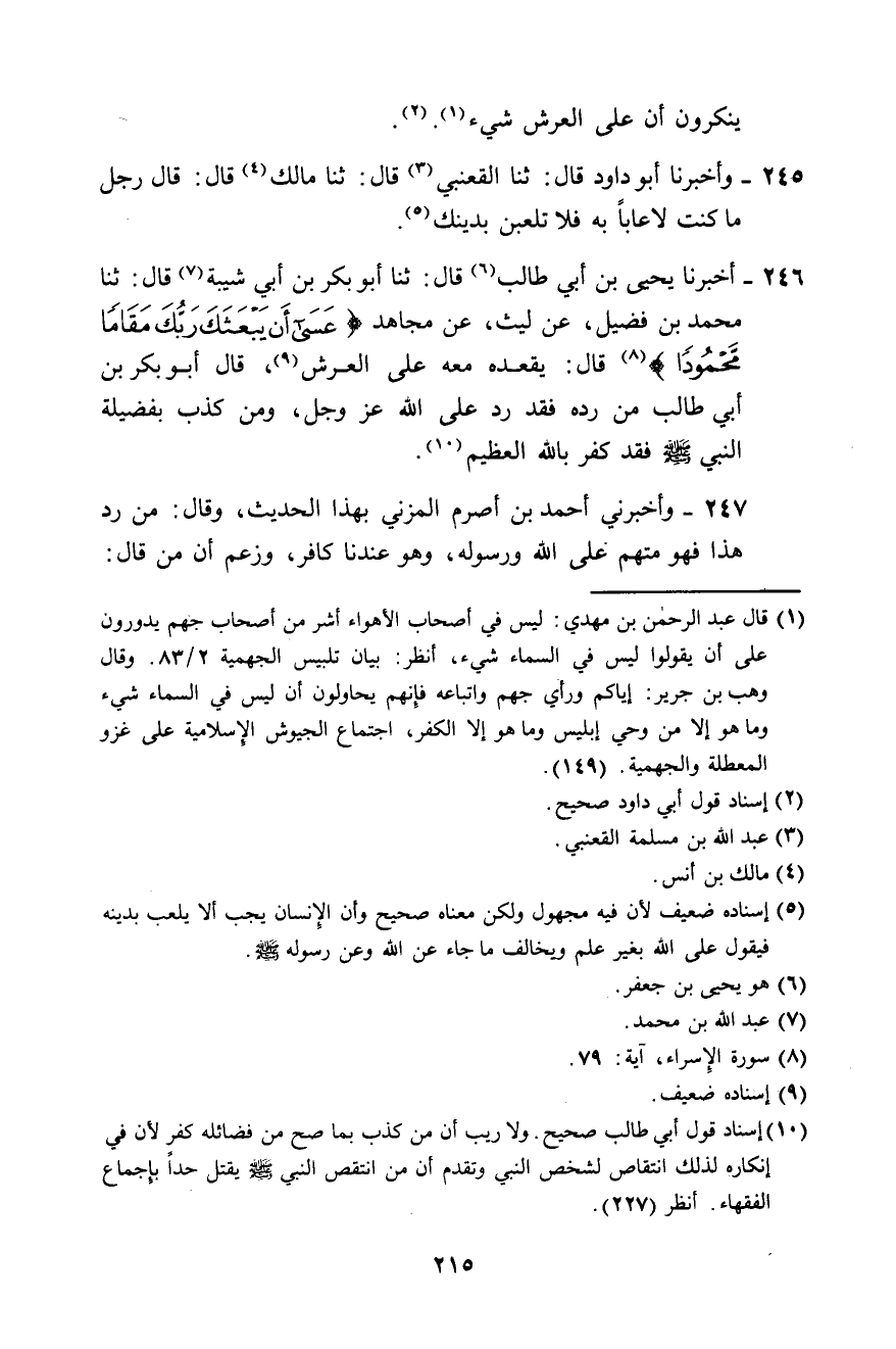 246 - أَخْبَرَنَا يَحْيَى بْنُ أَبِي طَالِبٍ، قَالَ: ثَنَا أَبُو بَكْرِ بْنُ أَبِي شَيْبَةَ، قَالَ: ثَنَا مُحَمَّدُ بْنُ فُضَيْلٍ، عَنْ لَيْثٍ، عَنْ مُجَاهِدٍ: {عَسَى أَنْ يَبْعَثَكَ رَبُّكَ مَقَامًا مَحْمُودًا} [الإسراء: 79] قَالَ: «§يُقْعِدُهُ مَعَهُ عَلَى الْعَرْشِ» ، قَالَ أَبُو بَكْرِ بْنُ أَبِي طَالِبٍ: مَنْ رَدَّهُ فَقَدْ رَدَّ عَلَى اللَّهِ عَزَّ وَجَلَّ، وَمَنْ كَذَّبَ بِفَضِيلَةِ النَّبِيِّ صَلَّى اللهُ عَلَيْهِ وَسَلَّمَ فَقَدْ كَفَرَ بِاللَّهِ الْعَظِيمِ.