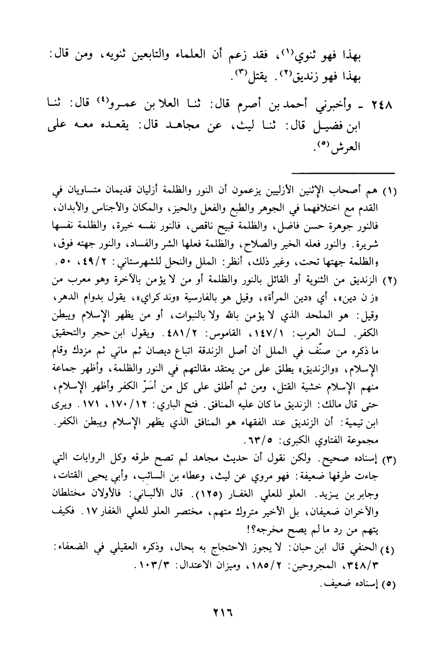 248 - وَأَخْبَرَنِي أَحْمَدُ بْنُ أَصْرَمَ، قَالَ: ثَنَا الْعَلَاءُ بْنُ عَمْرٍو، قَالَ: ثَنَا ابْنُ فُضَيْلٍ، قَالَ: ثَنَا لَيْثٌ، عَنْ مُجَاهِدٍ، قَالَ: «§يُقْعِدْهُ مَعَهُ عَلَى الْعَرْشِ» -[217]-.