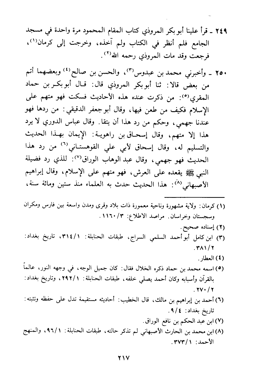 251 - وَأَخْبَرَنِي مُحَمَّدُ بْنُ عَبْدُوسٍ، وَالْحَسَنُ بْنُ صَالِحٍ، وَبَعْضُهُمَا أَتَمُّ مِنْ بَعْضٍ، قَالَا: ثَنَا أَبُو بَكْرٍ الْمَرُّوذِيُّ، قَالَ: قَالَ أَبُو بَكْرِ بْنُ حَمَّادٍ الْمُقْرِئُ: §مَنْ ذُكِرَتْ عِنْدَهُ هَذِهِ الْأَحَادِيثُ فَسَكَتَ فَهُوَ مُتَّهَمٌ عَلَى الْإِسْلَامِ، فَكَيْفَ مَنْ طَعَنَ فِيهَا؟، وَقَالَ أَبُو جَعْفَرٍ الدَّقِيقِيُّ: مَنْ رَدَّهَا فَهُوَ عِنْدَنَا جَهْمِيُّ، وَحُكْمُ مَنْ رَدَّ هَذَا أَنْ يُتَّقَى، وَقَالَ عَبَّاسٌ الدُّورِيُّ: لَا يَرُدُّ هَذَا إِلَّا مُتَّهَمٌ، وَقَالَ إِسْحَاقُ بْنُ رَاهَوَيْهِ: الْإِيمَانُ بِهَذَا الْحَدِيثِ وَالتَّسْلِيمُ لَهُ، وَقَالَ إِسْحَاقُ لِأَبِي عَلِيٍّ الْقُوهُسْتَانِيِّ: مَنْ رَدَّ هَذَا الْحَدِيثَ فَهُوَ جَهْمِيُّ، وَقَالَ عَبْدُ الْوَهَّابِ الْوَرَّاقُ لِلَّذِي رَدَّ فَضِيلَةَ النَّبِيِّ صَلَّى اللهُ عَلَيْهِ وَسَلَّمَ يُقْعِدُهُ عَلَى الْعَرْشِ فَهُوَ مُتَّهَمٌ عَلَى الْإِسْلَامِ، وَقَالَ إِبْرَاهِيمُ الْأَصْبَهَانِيُّ: هَذَا الْحَدِيثُ حَدَّثَ بِهِ الْعُلَمَاءُ مُنْذُ سِتِّينَ وَمِائَةِ سَنَةٍ، وَلَا يَرُدُّهُ إِلَّا أَهْلُ الْبِدَعِ، قَالَ: وَسَأَلْتُ حَمْدَانَ بْنَ عَلِيٍّ عَنْ هَذَا الْحَدِيثِ، فَقَالَ: كَتَبْتُهُ مُنْذُ خَمْسِينَ سَنَةً، وَمَا رَأَيْتُ أَحَدًا يَرُدُّهُ إِلَّا أَهْلُ الْبِدَعِ، وَقَالَ إِبْرَاهِيمُ الْحَرْبِيُّ: حَدَّثَنَا هَارُونُ بْنُ مَعْرُوفٍ، وَمَا يُنْكِرُ هَذَا إِلَّا أَهْلُ الْبِدَعِ، قَالَ هَارُونُ بْنُ مَعْرُوفٍ: هَذَا حَدِيثٌ يُسَخِّنُ اللَّهُ بِهِ أَعْيَنَ الزَّنَادِقَةِ، قَالَ: وَسَمِعْتُ مُحَمَّدَ بْنَ إِسْمَاعِيلَ السُّلَمِيَّ يَقُولُ: مَنْ تَوَهَّمَ أَنَّ مُحَمَّدًا صَلَّى اللهُ عَلَيْهِ وَسَلَّمَ لَمْ يَسْتَوْجِبْ مِنَ اللَّهِ عَزَّ وَجَلَّ مَا قَالَ مُجَاهِدٌ فَهُوَ كَافِرٌ بِاللَّهِ الْعَظِيمِ، قَالَ: وَسَمِعْتُ أَبَا عَبْدِ اللَّهِ الْخَفَّافَ يَقُولُ: سَمِعْتُ مُحَمَّدَ بْنَ مُصْعَبٍ يَعْنِي الْعَابِدَ يَقُولُ: نَعَمْ، يُقْعِدُهُ عَلَى الْعَرْشِ لِيَرَى الْخَلَائِقُ مَنْزِلَتَهُ