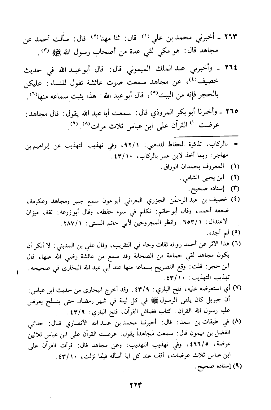 263 - أَخْبَرَنِي مُحَمَّدُ بْنُ عَلِيٍّ، قَالَ: ثَنَا مُهَنَّى، قَالَ: سَأَلْتُ أَحْمَدَ، عَنْ مُجَاهِدٍ، قَالَ: «§هُوَ مَكِّيٌّ، لَقِيَ عِدَّةً مِنْ أَصْحَابِ رَسُولِ اللَّهِ صَلَّى اللهُ عَلَيْهِ وَسَلَّمَ»