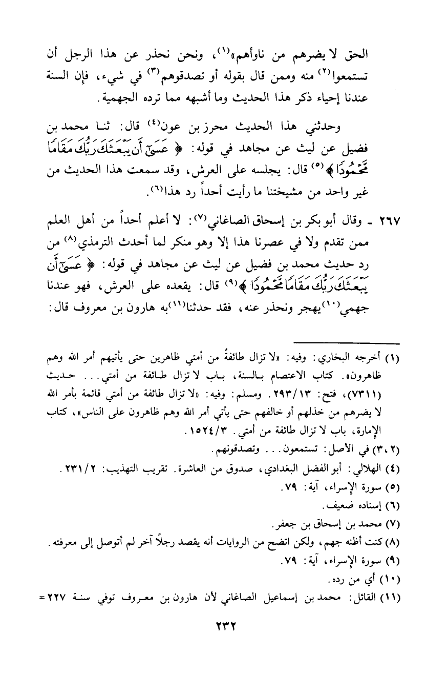 267 - وَقَالَ أَبُو بَكْرِ بْنُ إِسْحَاقَ الصَّاغَانِيُّ: لَا أَعْلَمُ أَحَدًا مِنْ أَهْلِ الْعِلْمِ مِمَّنْ تَقَدَّمَ، وَلَا فِي عَصْرِنَا هَذَا إِلَّا وَهُوَ مُنْكِرٌ لِمَا أَحْدَثَ التِّرْمِذِيُّ مِنْ رَدِّ حَدِيثِ مُحَمَّدِ بْنِ فُضَيْلٍ، عَنْ لَيْثٍ، عَنْ مُجَاهِدٍ فِي قَوْلِهِ {عَسَى أَنْ يَبْعَثَكَ رَبُّكَ مَقَامًا مَحْمُودًا} [الإسراء: 79] قَالَ: «يُقْعِدُهُ عَلَى الْعَرْشِ» ، فَهُوَ عِنْدَنَا جَهْمِيُّ، يُهْجَرُ وَنَحْذِرُ عَنْهُ، فَقَدْ حَدَّثَنَا بِهِ هَارُونُ بْنُ مَعْرُوفٍ، قَالَ -[233]-: حَدَّثَنَا مُحَمَّدُ بْنُ فُضَيْلٍ، عَنْ لَيْثٍ، عَنْ مُجَاهِدٍ فِي قَوْلِهِ {عَسَى أَنْ يَبْعَثَكَ رَبُّكَ مَقَامًا مَحْمُودًا} [الإسراء: 79] قَالَ: «§يُقْعِدُهُ عَلَى الْعَرْشِ» وَقَدْ رُوِيَ عَنْ عَبْدِ اللَّهِ بْنِ سَلَامٍ، قَالَ: «يُقْعِدُهُ عَلَى كُرْسِيِّ الرَّبِّ جَلَّ وَعَزَّ» ، فَقِيلَ لِلْجُرَيْرِيِّ: إِذَا كَانَ عَلَى كُرْسِيِّ الرَّبِّ فَهُوَ مَعَهُ، قَالَ: وَيْحَكُمْ، هَذَا أَقَرُّ لِعَيْنِي فِي الدُّنْيَا، وَقَدْ أَتَى عَلَيَّ نَيِّفٌ وَثَمَانُونَ سَنَةً مَا عَلِمْتُ أَنَّ أَحَدًا رَدَّ حَدِيثَ مُجَاهِدٍ إِلَّا جَهْمِيُّ، وَقَدْ جَاءَتْ بِهِ الْأَئِمَّةُ فِي الْأَمْصَارِ، وَتَلَقَّتْهُ الْعُلَمَاءُ بِالْقَبُولِ مُنْذُ نَيِّفٍ وَخَمْسِينَ وَمِائَةِ سَنَةٍ، وَبَعْدُ فَإِنِّي لَا أَعْرِفُ هَذَا التِّرْمِذِيَّ، وَلَا أَعْلَمُ أَنِّي رَأَيْتُهُ عِنْدَ مُحَدِّثٍ، فَعَلَيْكُمْ رَحِمَكُمُ اللَّهُ بِالتَّمَسُّكِ بِالسُّنَّةِ وَالِاتِّبَاعِ وَقَالَ أَبُو بَكْرٍ يَحْيَى بْنُ أَبِي طَالِبٍ: «لَا أَعْرِفُ هَذَا الْجَهْمِيَّ الْعَجَمِيَّ، لَا نَعْرِفُهُ عِنْدَ مُحَدِّثٍ، وَلَا عِنْدَ أَحَدٍ مِنْ إِخْوَانِنَا، وَلَا عَلِمْتُ أَحَدًا رَدَّ حَدِيثِ مُجَاهِدٍ» يُقْعِدُ مُحَمَّدًا صَلَّى اللهُ عَلَيْهِ وَسَلَّمَ عَلَى الْعَرْشِ "، رَوَاهُ الْخَلْقُ عَنِ ابْنِ فُضَيْلٍ عَنْ لَيْثٍ عَنْ مُجَاهِدٍ، وَاحْتَمَلَهُ الْمُحْدِثُونَ الثِّقَاتُ، وَحَدَّثُوا بِهِ عَلَى رُءُوسِ الْأَشْهَادِ، لَا يَدْفَعُونَ ذَلِكَ، يَتَلَقَّوْنَهُ بِالْقَبُولِ وَالسُّرُورِ بِذَلِكَ، وَأَنَا فِيمَا أَرَى أَنِّي أَعْقِلُ مُنْذُ سَبْعِينَ سَنَةً، وَاللَّهِ مَا أَعْرِفُ أَحَدًا رَدَّهُ، وَلَا يَرُدُّهُ إِلَّا كُلُّ جَهْمِيٍّ مُبْتَدَعٍ خَبِيثٍ، يَدْعُو إِلَى خِلَافِ مَا كَانَ عَلَيْهِ أَشْيَاخُنَا وَأَئِمَّتُنَا، عَجَّلَ اللَّهُ لَهُ الْعُقُوبَةَ، وَأَخْرَجَهُ مِنْ جِوَارِنَا، فَإِنَّهُ بَلِيَّةٌ عَلَى مَنِ ابْتُلِيَ بِهِ، فَالْحَمْدُ لِلَّهِ الَّذِي عَدَلَ عَنَّا مَا ابْتَلَاهُ بِهِ وَالَّذِي عِنْدَنَا، وَالْحَمْدُ لِلَّهِ أَنَّا نُؤْمِنُ بِحَدِيثِ مُجَاهِدٍ وَنَقُولُ بِهِ عَلَى مَا جَاءَ، وَنُسْلِمُ الْحَدِيثَ وَغَيْرَهُ مِمَّا يُخَالِفُ فِيهِ الْجَهْمِيَّةَ مِنَ الرُّؤْيَةِ وَالصِّفَاتِ، وَقُرْبِ مُحَمَّدٍ صَلَّى اللهُ عَلَيْهِ وَسَلَّمَ مِنْهُ، وَقَدْ كَانَ كَتَبَ إِلَيَّ هَذَا الْعَجَمِيُّ التِّرْمِذِيُّ كِتَابًا بِخَطِّهِ، وَدَفَعْتُهُ إِلَى أَبِي بَكْرٍ الْمَرُّوذِيِّ، وَفِيهِ: أَنَّ مَنْ قَالَ بِحَدِيثِ مُجَاهِدٍ فَهُوَ جَهْمِيُّ ثَنَوِيُّ، وَكَذَبَ الْكَذَّابُ الْمُخَالِفُ لِلْإِسْلَامِ، فَحَذَرُوا عَنْهُ، وَأَخْبِرُوا عَنِّي أَنَّهُ مَنْ قَالَ بِخِلَافِ مَا كَتَبْتُ بِهِ فَهُوَ جَهْمِيُّ، فَلَوْ أَمْكَنَنِي لَأَقَمْتُهُ لِلنَّاسِ، وَنَادَيْتُ عَلَيْهِ حَتَّى أُشْهِرَهُ لِيَحْذَرَ النَّاسَ مَا قَدْ أَحْدَثَ فِي الْإِسْلَامِ، فَهَذَا دِينِي الَّذِي أَدِينُ للَّهِ عَزَّ وَجَلَّ بِهِ، أَسْأَلُ اللَّهَ أَنْ يُمِيتَنَا وَيُحْيِيَنَا عَلَيْهِ وَقَالَ عَلِيُّ بْنُ دَاوُدَ الْقَنْطَرِيُ