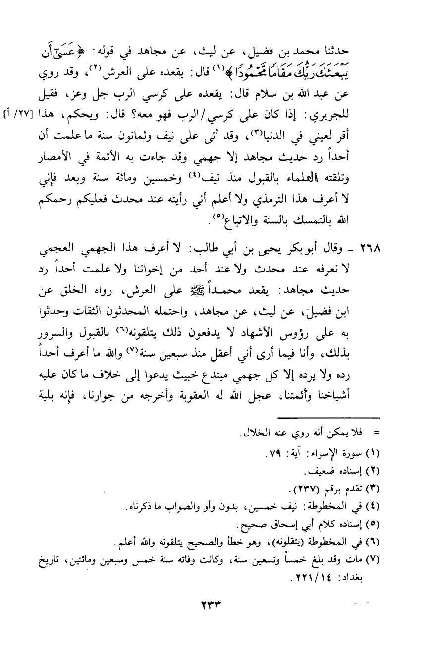 268 - حَدَّثَنَا هَارُونُ بْنُ مَعْرُوفٍ، عَنِ ابْنِ فُضَيْلٍ، عَنْ لَيْثٍ، عَنْ مُجَاهِدٍ {§عَسَى أَنْ يَبْعَثَكَ رَبُّكَ مَقَامًا مَحْمُودًا} [الإسراء: 79] قَالَ: يُقْعِدُهُ عَلَى الْعَرْشِ " وَإِنِّي لَأَرْجُو أَنْ تَكُونَ مَنْزِلَتُهُ عِنْدَ اللَّهِ تَبَارَكَ وَتَعَالَى أَكْثَرَ مِنْ هَذَا، وَمَنْ رَدَّ عَلَى مُجَاهِدٍ مَا قَالَهُ مِنْ قُعُودِ مُحَمَّدٍ صَلَّى اللهُ عَلَيْهِ وَسَلَّمَ عَلَى الْعَرْشِ وَغَيْرَهُ، فَقَدْ كَذَبَ، وَلَا أَعْلَمُ أَنِّي رَأَيْتُ هَذَا التِّرْمِذِيَّ الَّذِي يُنْكِرُ حَدِيثَ مُجَاهِدٍ قَطُّ فِي حَدِيثٍ وَلَا غَيْرِ حَدِيثٍ. وَقَالَ أَبُو دَاوُدَ السِّجِسْتَانِيُّ: أَرَى أَنْ يُجَانَبَ كُلُّ مَنْ رَدَّ حَدِيثَ لَيْثٍ، عَنْ مُجَاهِدٍ: يُقْعِدُهُ عَلَى الْعَرْشِ "، وَيُحَذَّرُ عَنْهُ، حَتَّى يُرَاجِعَ الْحَقَّ، مَا ظَنَنْتُ أَنَّ أَحَدًا يُذَكِّرُ بِالسُّنَّةِ يَتَكَلَّمُ فِي هَذَا الْحَدِيثِ إِلَّا إِنَّا عَلِمْنَا أَنَّ الْجَهْمِيَّةَ تُنْكِرُهُ مِنْ جِهَةِ إِثْبَاتِ الْعَرْشِ، فَإِنَّهُمْ يُنْكِرُونَ أَمْرَ الْعَرْشِ، وَيَقُولُونَ: الْعَرْشُ عَظَمَةٌ، مَعَ أَنَّهُمْ لَمْ يُنْكِرُوا مِنْهُ فَضِيلَةَ النَّبِيِّ صَلَّى اللهُ عَلَيْهِ وَسَلَّمَ، وَأَنَّ هَذَا التِّرْمِذِيَّ رَجُلٌ لَا أَعْرِفُهُ وَرَأَيْتُ مَنْ عِنْدِي مِنْ أَصْحَابِنَا، يَذْكُرُونَ أَنَّهُمْ لَا يَعْرِفُونَهُ فِي الطَّلَبِ، وَلَا عَرَفْتُهُ أَنَا، وَمُجَاهِدٌ كَانَتْ لَهُ جَلَالَةٌ عِنْدَ أَصْحَابِ النَّبِيِّ صَلَّى اللهُ عَلَيْهِ وَسَلَّمَ عِنْدَ ابْنِ عَبَّاسٍ وَابْنِ عُمَرَ، يَأْخُذُ لَهُ بِالرِّكَابِ، أَسْأَلُ اللَّهَ أَنْ يَمُنَّ عَلَيْنَا، وَعَلَيْكُمْ بِلُزُومِ السُّنَّةِ، وَالِاقْتِدَاءِ بِالسَّلَفِ الصَّالِحِ، بِأَبِي عَبْدِ اللَّهِ رَضِيَ اللَّهُ عَنْهُ، فَإِنَّهُ أَوْضَحَ مِنْ هَذِهِ الْأُمُورِ الْمُحْدَثَاتِ مَا هُوَ كِفَايَةٌ لِمَنِ اقْتَدَى بِهِ. قَالَ مُحَمَّدُ بْنُ إِسْمَاعِيلَ السُّلَمِيُّ: كُلُّ مَنْ ظَنَّ أَوْ تَوَهَّمَ أَنَّ رَسُولَ اللَّهِ صَلَّى اللهُ عَلَيْهِ وَسَلَّمَ لَمْ يَسْتَوْجِبْ مِنَ اللَّهِ عَزَّ وَجَلَّ هَذِهِ الْمَنْزِلَةَ فِي حَدِيثِ مُجَاهِدٍ فَهُوَ عِنْدَنَا جَهْمِيُّ، وَإِنَّ هَذِهِ الْمُصِيبَةَ عَلَى أَهْلِ الْإِسْلَامِ أَنْ يَذْكُرَ أَحَدٌ النَّبِيَّ صَلَّى اللهُ عَلَيْهِ وَسَلَّمَ، وَلَا يَقْدُمُوا عَلَيْهِ بِأَجْمَعِهِمْ، وَلَوْلَا أَنَّ أَبَا بَكْرٍ الْمَرُّوذِيَّ رَحِمَهُ اللَّهُ اجْتَهَدَ فِي هَذَا لَخِفْتُ أَنْ يَنْزِلَ بِنَا وَبِمَنْ يَقْصُرُ عَنْ هَذَا الضَّالِّ الْمُضِلِّ عُقُوبَةٌ، فَإِنَّهُ مِنْ شَرِّ الْجَهْمِيَّةِ مَا يُبَالِي مَا تَكَلَّمَ بِهِ، قَالَ: لَيْسَ هَذَا عَرْشَ رَبِّ الْعَالَمِينَ، إِنَّمَا هُوَ مِثْلُ عَرْشِ بِلْقِيسَ، وَعَرْشٌ مِنَ الْعُرُوشِ شَبَّهَ عَرْشَ الْآدَمَيِّينَ بِعَرْشِ الرَّحْمَنِ عَزَّ وَجَلَّ، لَا يَرْعَوِي عَنْ دَفْعِ فَضِيلَةِ النَّبِيِّ صَلَّى اللهُ عَلَيْهِ وَسَلَّمَ، فَكَيْفَ بِمَنْ بَعْدَ النَّبِيِّ صَلَّى اللهُ عَلَيْهِ وَسَلَّمَ، لَا شَكَّ فِي تَجَهُّمِهِ، وَلَا نَقْدِرُ عَلَى أَكْثَرَ مِنَ الدُّعَاءِ وَالتَّحْذِيرِ وَتَبْيِينِ أَمْرِهِ، وَنُعَادِي مَنْ يَنْصُرُهُ، أَوْ يَمِيلُ إِلَى مَنْ يَنْصُرُهُ بِتَكْفِيرِ مُجَاهِدٍ، وَمَنْ قَالَ بِقَوْلِ مُجَاهِدٍ فِي {عَسَى أَنْ يَبْعَثَكَ رَبُّكَ مَقَامًا مَحْمُودًا} [الإسراء: 79] فَإِنَّهُ يُقْعِدُهُ عَلَى الْعَرْشِ، فَقَالَ: هَذَا كُفْرٌ، وَمَنْ قَالَ: بِهِ فَهُوَ كَافِرٌ، سَمِعْتُهُ يَقُولُ ذَلِكَ وَقَالَ أَبُو الْعَبَّاسِ هَارُونُ بْنُ الْعَبَّاسِ الْهَاشِمِيُّ: مَنْ رَدَّ حَدِيثَ مُجَاهِدٍ فَهُوَ عِنْدِي جَهْمِيُّ، وَمَن