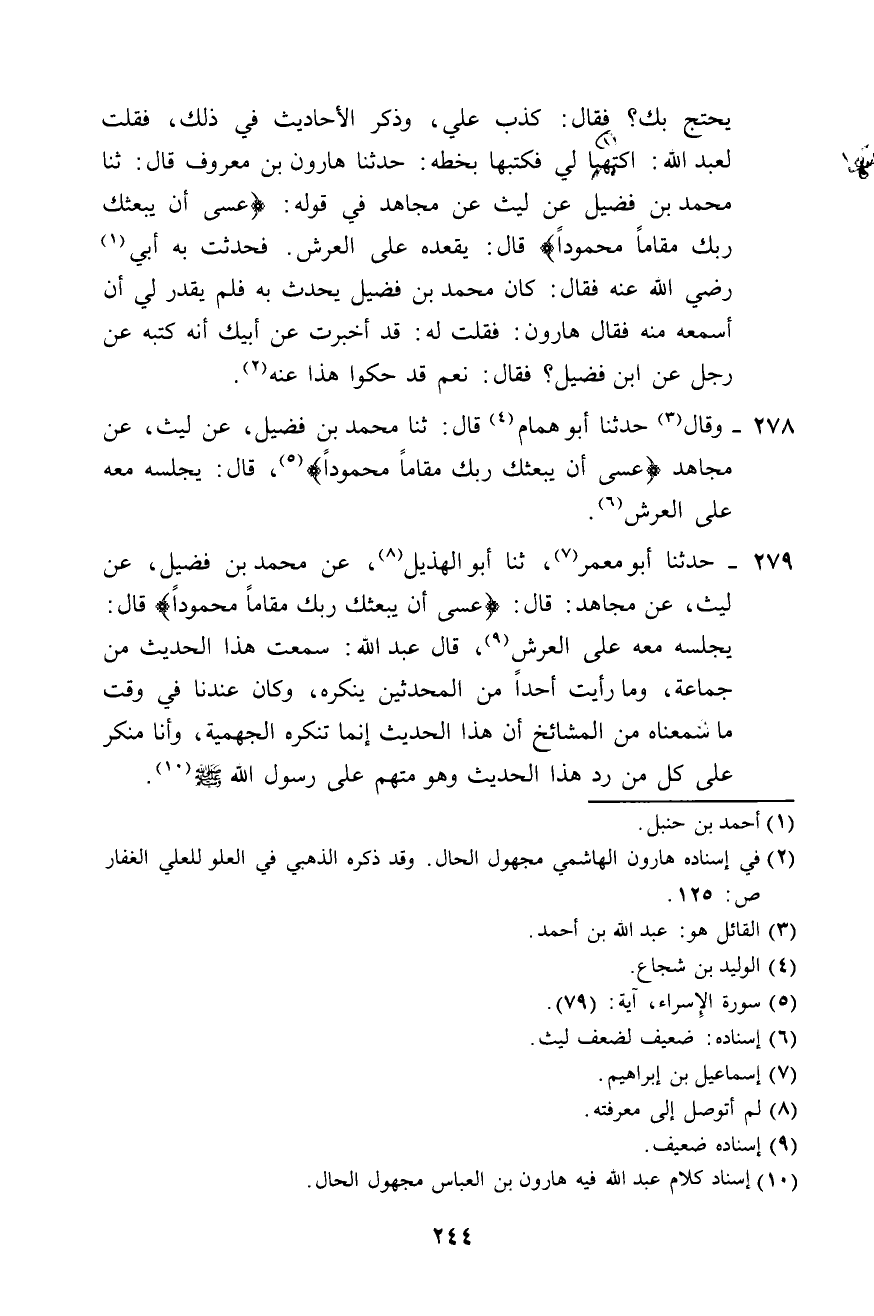 279 - حَدَّثَنَا أَبُو مَعْمَرٍ، ثَنَا أَبُو الْهُذَيْلِ، عَنْ مُحَمَّدِ بْنِ فُضَيْلٍ، عَنْ لَيْثٍ، عَنْ مُجَاهِدٍ، قَالَ: {عَسَى أَنْ يَبْعَثَكَ رَبُّكَ مَقَامًا مَحْمُودًا} [الإسراء: 79] قَالَ: «§يُجْلِسُهُ مَعَهُ عَلَى الْعَرْشِ» ، قَالَ عَبْدُ اللَّهِ: سَمِعْتُ هَذَا الْحَدِيثَ مِنْ جَمَاعَةٍ، وَمَا رَأَيْتُ أَحَدًا مِنَ الْمُحَدِّثِينَ يُنْكِرُهُ، وَكَانَ عِنْدَنَا فِي وَقْتٍ مَا سَمِعْنَاهُ مِنَ الْمَشَايِخِ أَنَّ هَذَا الْحَدِيثَ إِنَّمَا تُنْكِرُهُ الْجَهْمِيَّةُ، وَأَنَا مُنْكَرٌ عَلَى كُلِّ مَنْ رَدَّ هَذَا الْحَدِيثَ، وَهُوَ مُتَّهِمٌ عَلَى رَسُولِ اللَّهِ صَلَّى اللهُ عَلَيْهِ وَسَلَّمَ