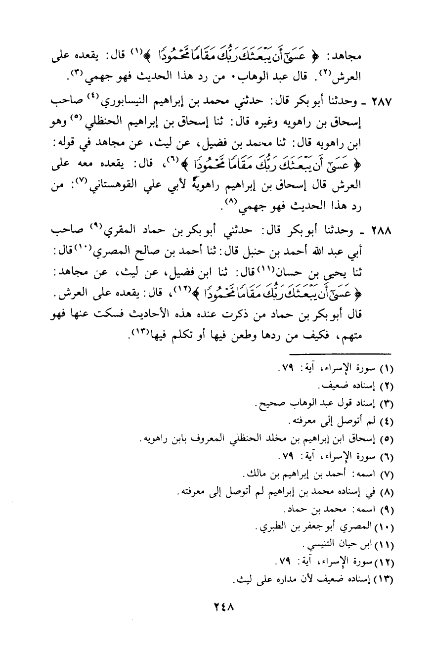287 - وَحَدَّثَنَا أَبُو بَكْرٍ، قَالَ: حَدَّثَنِي مُحَمَّدُ بْنُ إِبْرَاهِيمَ النَّيْسَابُورِيُّ صَاحِبُ إِسْحَاقَ بْنِ رَاهَوَيْهِ، وَغَيْرُهُ، قَالَ: ثَنَا إِسْحَاقُ بْنُ إِبْرَاهِيمَ الْحَنْظَلِيُّ وَهُوَ ابْنُ رَاهَوَيْهِ، قَالَ: ثَنَا مُحَمَّدُ بْنُ فُضَيْلٍ، عَنْ لَيْثٍ، عَنْ مُجَاهِدٍ، فِي قَوْلِهِ: {عَسَى أَنْ يَبْعَثَكَ رَبُّكَ مَقَامًا مَحْمُودًا} [الإسراء: 79] قَالَ: «§يُقْعِدُهُ مَعَهُ عَلَى الْعَرْشِ» ، قَالَ إِسْحَاقُ بْنُ إِبْرَاهِيمَ بْنِ رَاهَوَيْهِ لِأَبِي عَلِيٍّ الْقُوهُسْتَانِيِّ: «مَنْ رَدَّ هَذَا الْحَدِيثَ فَهُوَ جَهْمِيُّ»
