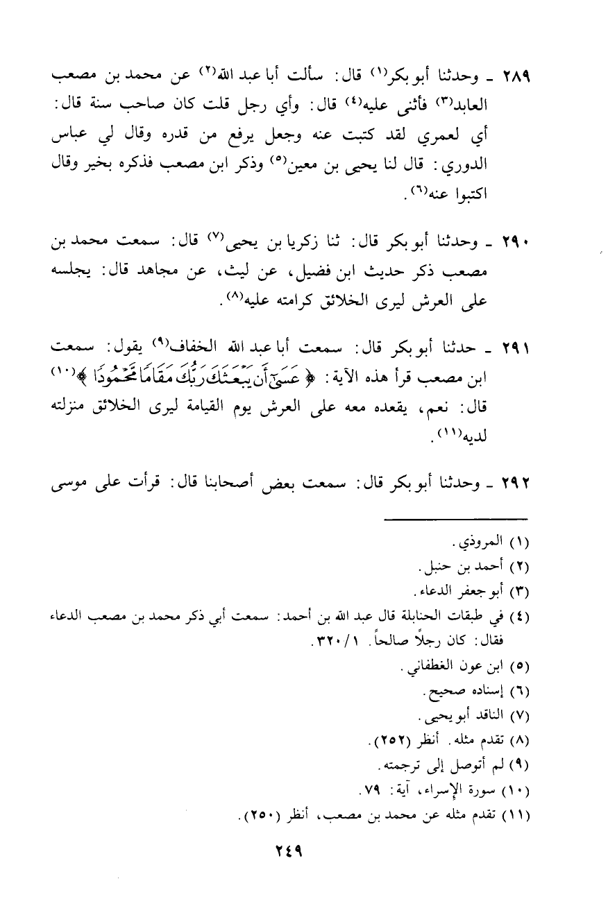 291 - حَدَّثَنَا أَبُو بَكْرٍ، قالِ: سَمِعْتُ أَبَا عَبْدِ اللَّهِ الْخَفَّافَ، يَقُولُ: سَمِعْتُ ابْنَ مُصْعَبٍ، قَرَأَ هَذِهِ الْآيَةَ: {عَسَى أَنْ يَبْعَثَكَ رَبُّكَ مَقَامًا مَحْمُودًا} [الإسراء: 79] قَالَ: نَعَمْ، §يُقْعِدُهُ مَعَهُ عَلَى الْعَرْشِ يَوْمَ الْقِيَامَةِ؛ لِيُرِيَ الْخَلَائِقَ مَنْزِلَتَهُ لَدَيْهِ "