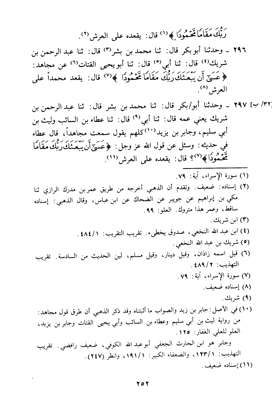 297 - وَحَدَّثَنَا أَبُو بَكْرٍ، قَالَ: ثَنَا مُحَمَّدُ بْنُ بِشْرٍ، قَالَ: ثَنَا عَبْدُ الرَّحْمَنِ بْنُ شَرِيكٍ يَعْنِي عَمَّهُ، قَالَ: ثَنَا أَبِي، قَالَ: ثَنَا عَطَاءُ بْنُ السَّائِبِ، وَلَيْثُ بْنُ أَبِي سُلَيْمٍ، وَجَابِرُ بْنُ يَزِيدَ، كُلُّهُمْ يَقُولُ: سَمِعْتُ مُجَاهِدًا، قَالَ عَطَاءٌ فِي حَدِيثِهِ: وَسُئِلَ عَنْ قَوْلِ اللَّهِ، عَزَّ وَجَلَّ: {عَسَى أَنْ يَبْعَثَكَ رَبُّكَ مَقَامًا مَحْمُودًا} [الإسراء: 79] قَالَ: «§يُقْعِدُهُ عَلَى الْعَرْشِ»