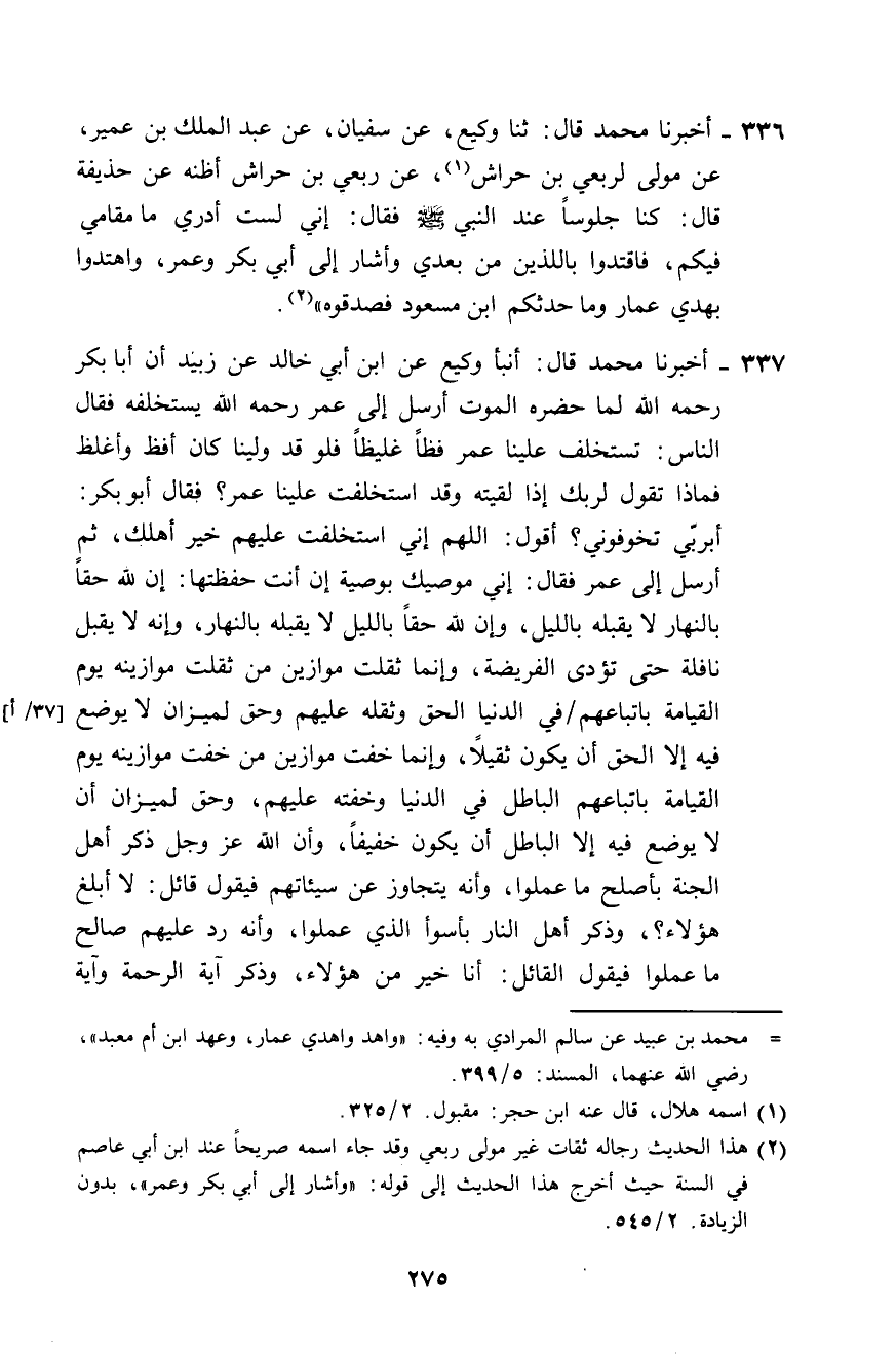 313 - حَدَّثَنَا أَبُو بَكْرٍ، قَالَ: ثَنَا الْفَضْلُ بْنُ سُلَيْمَانَ، قَالَ: ثَنَا الْهَيْثَمُ بْنُ خَارِجَةَ، قَالَ: ثَنَا الْوَلِيدُ بْنُ مُسْلِمٍ، قَالَ: سَأَلْتُ سُفْيَانَ، وَالْأَوْزَاعِيَّ، وَمَالِكَ بْنَ أَنَسٍ، وَاللَّيْثَ بْنَ سَعْدٍ، عَنْ هَذِهِ الْأَحَادِيثِ،؟ فَقَالُوا: «§نُمِرُّهَا كَمَا جَاءَتْ»