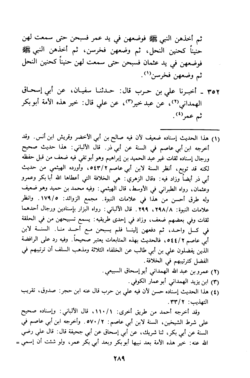 352 - أَخْبَرَنَا عَلِيُّ بْنُ حَرْبٍ، قَالَ: حَدَّثَنَا سُفْيَانُ، عَنْ أَبِي إِسْحَاقَ الْهَمْدَانِيِّ، عَنْ عَبْدِ خَيْرٍ، عَنْ عَلِيٍّ، قَالَ: «§خَيْرُ هَذِهِ الْأُمَّةِ أَبُو بَكْرٍ، ثُمَّ عُمَرُ»