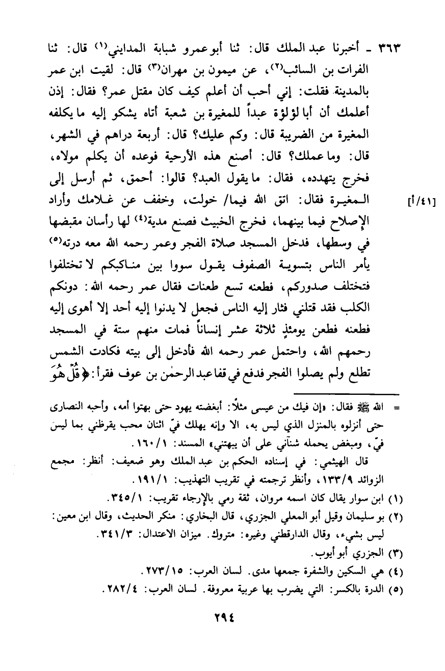 363 - أَخْبَرَنَا عَبْدُ الْمَلِكِ، قَالَ: ثَنَا أَبُو عَمْرٍو شَبَابَةُ الْمَدَايِنِيُّ قَالَ: ثَنَا الْفُرَاتُ بْنُ السَّائِبِ، عَنْ مَيْمُونِ بْنِ مِهْرَانَ، قَالَ: لَقِيتُ ابْنَ عُمَرَ بِالْمَدِينَةِ فَقُلْتُ: إِنِّي أُحِبُّ أَنْ أَعْلَمَ كَيْفَ كَانَ مَقْتَلُ عُمَرَ، فَقَالَ: إِذَنْ أُعْلِمُكَ أَنَّ أَبَا لُؤْلُؤَةَ عَبْدًا لِلْمُغِيرَةَ بْنِ شُعْبَةَ أَتَاهُ يَشْكُو إِلَيْهِ مَا يُكَلِّفُهُ الْمُغِيرَةُ مِنَ الضَّرِيبَةِ، قَالَ: وَكَمْ عَلَيْكَ؟ قَالَ: أَرْبَعَةُ دَرَاهِمَ فِي الشَّهْرِ، قَالَ: وَمَا عَمَلُكَ؟ قَالَ: أَصْنَعُ هَذِهِ الْأَرْحِيَةَ، فَوَعَدَهُ أَنْ يُكَلِّمَ مَوْلَاهُ، فَخَرَجَ يَتَهَدَّدَهُ، فَقَالَ: مَا يَقُولُ الْعَبْدُ؟ قَالُوا أَحْمَقُ، ثُمَّ أَرْسَلَ إِلَى الْمُغِيرَةِ، فَقَالَ: اتَّقِ اللَّهَ فِيمَا خُوِّلْتَ وَخَفِّفْ عَنْ غُلَامِكَ، وَأَرَادَ الْإِصْلَاحَ فِيمَا بَيْنَهُمَا فَخَرَجَ الْخَبِيثُ فَصَنَعَ مُدْيَةً لَهَا رَأْسَانِ مَقْبِضُهَا فِي وَسَطِهَا، فَدَخَلَ الْمَسْجِدَ صَلَاةَ الْفَجْرِ، وَعُمَرُ رَحِمَهُ اللَّهُ مَعَهُ دِرَّتُهُ، يَأْمُرُ النَّاسَ بِتَسْوِيَةِ الصُّفُوفِ يَقُولُ: §سَوُّوا بَيْنَ مَنَاكِبِكُمْ، لَا تَخْتَلِفُوا فَتَخْتَلِفَ صُدُورُكُمْ، فَطَعَنَهُ تِسْعَ طَعْنَاتٍ، فَقَالَ عُمَرُ رَحِمَهُ اللَّهُ: دُونَكُمُ الْكَلْبَ فَقَدْ قَتَلَنِي، فَثَارَ إِلَيْهِ النَّاسُ، فَجَعَلَ لَا يَدْنُو إِلَيْهِ أَحَدٌ إِلَّا أَهْوَى إِلَيْهِ فَطَعَنَهُ، فَطَعَنَ يَوْمَئِذٍ ثَلَاثَةَ عَشَرَ إِنْسَانًا، فَمَاتَ مِنْهُمْ سِتَّةٌ فِي الْمَسْجِدِ رَحِمَهُمُ اللَّهُ، وَاحْتُمِلَ عُمَرُ رَحِمَهُ اللَّهُ فَأُدْخِلَ إِلَى بَيْتِهِ، فَكَادَتِ الشَّمْسُ تَطْلُعُ وَلَمْ يُصَلُّوا الْفَجْرَ، فَدَفَعَ فِي قَفَا عَبْدِ الرَّحْمَنِ بْنِ عَوْفٍ، فَقَرَأَ قُلْ هُوَ اللَّهُ أَحَدٌ -[295]- وَإِذَا جَاءَ نَصْرُ اللَّهِ وَالْفَتْحُ مُبَادَرَةً لِلشَّمْسِ، ثُمَّ انْجَفَلَ النَّاسُ إِلَى مَنْزِلِ عُمَرَ رَحِمَهُ اللَّهُ، فَقَالَ لِي: أَيْ بُنَيَّ، اخْرُجْ إِلَى النَّاسِ فَأَقْرِئْهُمُ السَّلَامَ وَرَحْمَةَ اللَّهِ، وَسَلْهُمْ عَنْ مَلَأٍ كَانَ هَذَا مِنْهُمْ، فَخَرَجَ إِلَيْهِمْ، فَذَكَرَ ذَلِكَ لَهُمْ، فَقَالُوا: مَعَاذَ اللَّهِ، وَحَاشَ لِلَّهِ، وَاللَّهِ لَوَدِدْنَا أَنَّا فَدَيْنَاهُ بِالْآبَاءِ وَالْأَبْنَاءِ، وَاللَّهِ مَا أَتَى عَلَيْنَا يَوْمٌ قَطُّ بَعْدَ وَفَاةِ رَسُولِ اللَّهِ صَلَّى اللهُ عَلَيْهِ وَسَلَّمَ أَعْظَمَ مِنْ هَذَا الْيَوْمِ، ثُمَّ قَالَ لِابْنِ عَبَّاسٍ: سَلِ النَّاسَ، هَلْ يُثْبِتُونَ لِي قَاتِلًا؟ فَقَالَ: نَعَمْ، قَتَلَكَ قَيْنُ الْمُغِيرَةِ بْنِ شُعْبَةَ، فَاسْتَهَلَّ بِحَمْدِ اللَّهِ عَزَّ وَجَلَّ إِلَّا يَكُونُ ذُو حَقٍّ فِي الْفَيْءِ، إِنَّمَا اسْتُحِلَّ دَمُهُ بِمَا اسْتَحَلَّ مَنْ فِيهِ عَنْ غَيْرِ مُؤَامَرَتِهِ، وَكَانَ أَوَّلَ مَنْ دَخَلَ عَلَيْهِ عَلِيٌّ وَابْنُ عَبَّاسٍ، فَلَمَّا نَظَرَ إِلَيْهِ ابْنُ عَبَّاسٍ بَكَى، فَقَالَ: أَبْشِرْ يَا أَمِيرَ الْمُؤْمِنِينَ بِالْجَنَّةِ، قَالَ: تَشْهَدُ لِي بِذَلِكَ؟ قَالَ: فَكَأَنَّهُ كَعَّ، فَضَرَبَ عَلِيُّ بْنُ أَبِي طَالِبٍ رَحِمَهُ اللَّهُ مَنْكِبَهُ فَقَالَ: أَجَلْ، فَاشْهَدْ، وَأَنَا عَلَى ذَلِكَ مِنَ الشَّاهِدِينَ، فَقَالَ عُمَرُ: كَيْفَ؟ قَالَ ابْنُ عَبَّاسٍ: كَانَ إِسْلَامُكَ عِزًّا، وَوِلَايَتُكَ عَدْلًا، وَمِيتَتُكَ شَهَادَةً، فَقَالَ: لَا وَاللَّهِ لَا تَغْرُونِي مِنْ رَبِّي وَدِينِي، ثَكِلَتْ عُمَرَ أُمُّهُ إِنْ لَمْ يَرْحَمْهُ رَبُّهُ، ثُمَّ قَالَ وَرَأْسُهُ فِي حِجْرِي: ضَعْ رَأْسِي بِالْأَرْضِ، فَقُلْتُ: إِنَّهُ يَشُقُّ عَلَيْكَ أَنْ تُصَوِّبَ، فَقَا