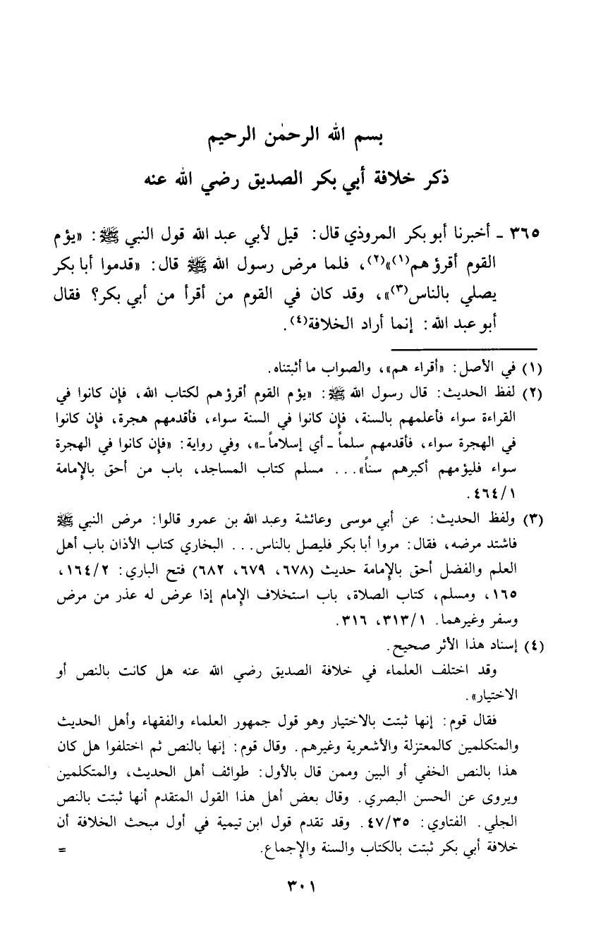 365 - أَخْبَرَنَا أَبُو بَكْرٍ الْمَرُّوذِيُّ، قَالَ: قِيلَ لِأَبِي عَبْدِ اللَّهِ: قَوْلُ النَّبِيِّ صَلَّى اللهُ عَلَيْهِ وَسَلَّمَ: §يَؤُمُّ الْقَوْمَ أَقْرَؤُهُمْ، فَلَمَّا مَرِضَ رَسُولُ اللَّهِ صَلَّى اللهُ عَلَيْهِ وَسَلَّمَ قَالَ: قَدِّمُوا أَبَا بَكْرٍ يُصَلِّي بِالنَّاسِ، وَقَدْ كَانَ فِي الْقَوْمِ مَنْ أَقْرَأُ مِنْ أَبِي بَكْرٍ؟ فَقَالَ أَبُو عَبْدِ اللَّهِ: «إِنَّمَا أَرَادَ الْخِلَافَةَ»