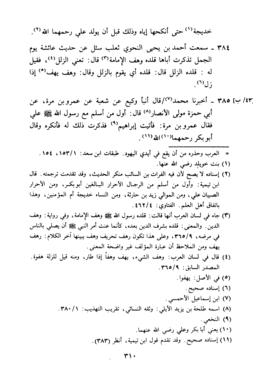 384 - سَمِعْتُ أَحْمَدَ بْنَ يَحْيَى النَّحْوِيَّ ثَعْلَبَ، سُئِلَ عَنْ حَدِيثِ عَائِشَةَ يَوْمَ الْجَمَلِ: تَذَكَّرَتْ أَبَاهَا قَلَّدَهُ وَهْفَ الْإِمَامَةِ، قَالَ: §تَعْنِي الزَّلَلَ، فَقِيلَ لَهُ: قَلَّدَهُ الزَّلَلَ؟ قَالَ: قَلَّدَهُ، أَيْ يَقُومُ بِالزَّلَلِ، وَقَالَ: وَهَفَ يَهِفُ إِذَا زَلَّ