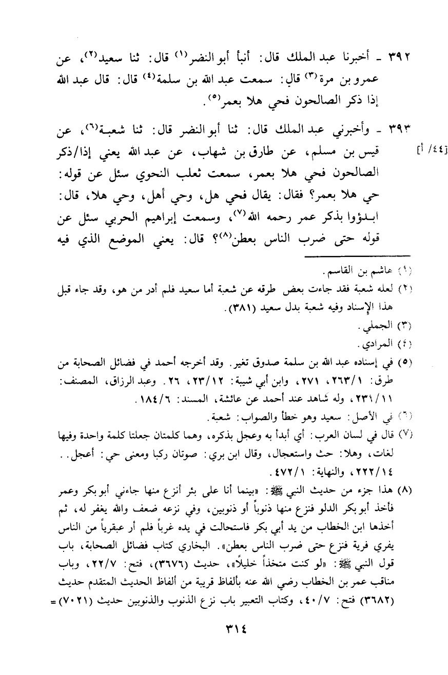 393 - وَأَخْبَرَنِي عَبْدُ الْمَلِكِ، قَالَ: ثَنَا أَبُو النَّضْرِ، قَالَ: ثَنَا شُعْبَةُ، عَنْ قَيْسِ بْنِ مُسْلِمٍ، عَنْ طَارِقِ بْنِ شِهَابٍ، عَنْ عَبْدِ اللَّهِ يَعْنِي §إِذَا ذُكِرَ الصَّالِحُونَ فَحَيَّ هَلَا بِعُمَرَ "