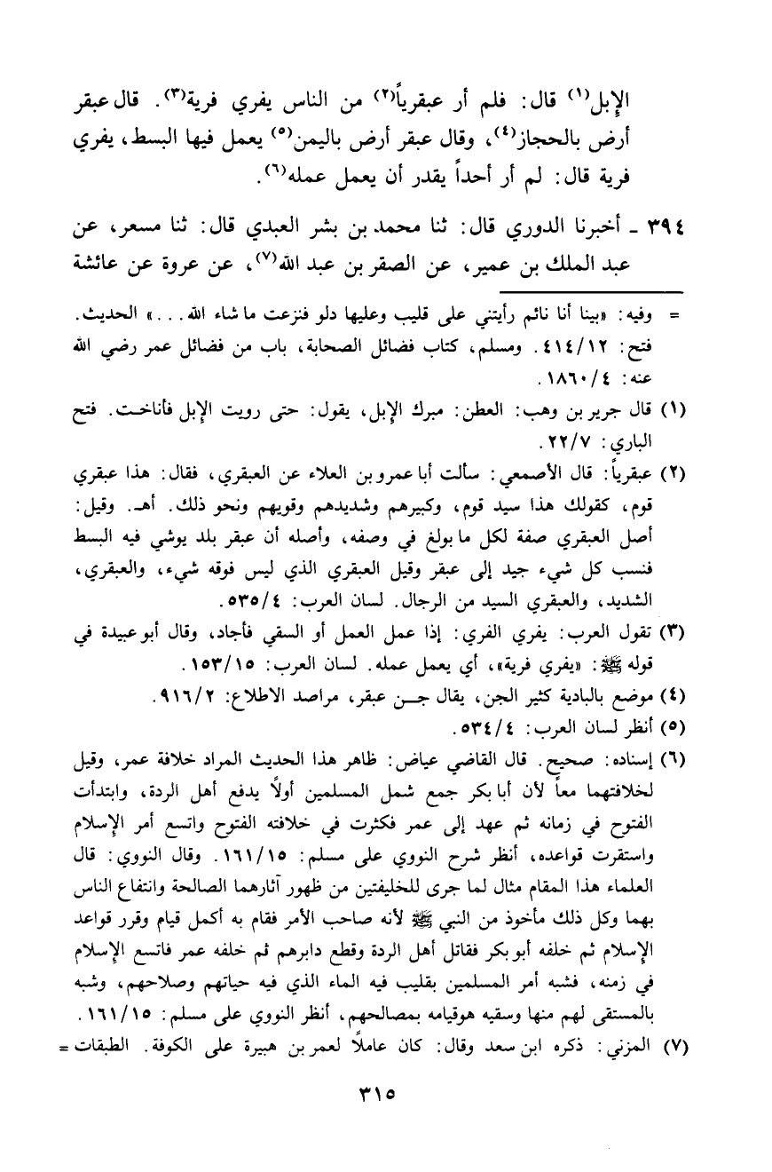 394 - أَخْبَرَنَا الدُّورِيُّ، قَالَ: ثَنَا مُحَمَّدُ بْنُ بِشْرٍ الْعَبْدِيُّ، قَالَ: ثَنَا مِسْعَرٌ، عَنْ عَبْدِ الْمَلِكِ بْنِ عُمَيْرٍ، عَنِ الصَّقْرِ بْنِ عَبْدِ اللَّهِ، عَنْ عُرْوَةَ، عَنْ عَائِشَةَ -[316]-، قَالَتْ: " §بَكَتِ الْجِنُّ عَلَى عُمَرَ قَبْلَ أَنْ يُقْتَلَ بِثَلَاثٍ فَقَالَتْ: