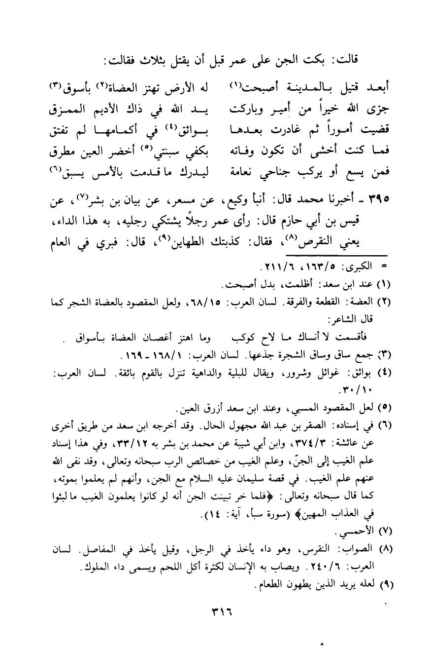 395 - أَخْبَرَنَا مُحَمَّدٌ، قَالَ: أَنْبَأَ وَكِيعٌ، عَنْ مِسْعَرٍ، عَنْ بَيَانِ بْنِ بِشْرٍ، عَنْ قَيْسِ بْنِ أَبِي حَازِمٍ، قَالَ: رَأَى عُمَرُ رَجُلًا يَشْتَكِي رِجْلَيْهِ، بِهِ هَذَا الدَّاءُ، يَعْنِي النَّقْرَسَ، فَقَالَ: «§كَذَبَتْكَ الطَّهَايِنُ» ، قَالَ: فبَرِيَ فِي الْعَامِ -[317]- الْمُقْبِلِ مَا يَشْتَكِي شَيْئًا