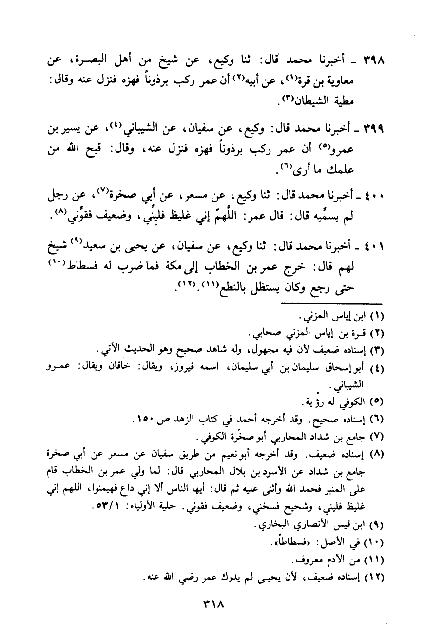 398 - أَخْبَرَنَا مُحَمَّدٌ، قَالَ: ثَنَا وَكِيعٌ، عَنْ شَيْخٍ مِنْ أَهْلِ الْبَصْرَةِ، عَنْ مُعَاوِيَةَ بْنِ قُرَّةَ، عَنْ أَبِيهِ، §أَنَّ عُمَرَ رَكِبَ بِرْذَوْنًا، فَهَزَّهُ فَنَزَلَ عَنْهُ، وَقَالَ: «مَطِيَّةُ الشَّيْطَانِ»