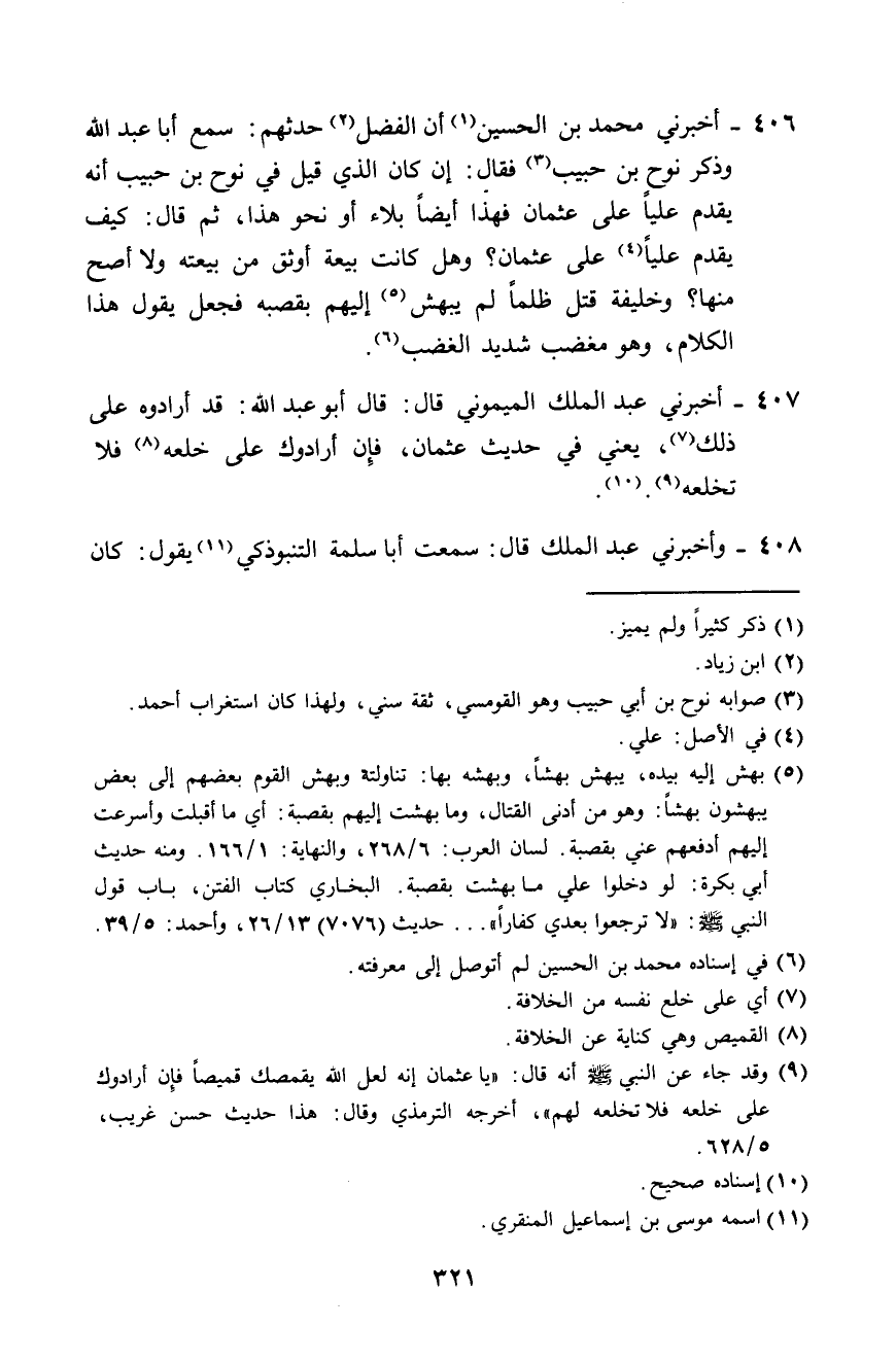 406 - أَخْبَرَنِي مُحَمَّدُ بْنُ الْحُسَيْنِ، أَنَّ الْفَضْلَ حَدَّثَهُمْ: سَمِعَ أَبَا عَبْدِ اللَّهِ، وَذَكَرَ نُوحَ بْنَ حَبِيبٍ، فَقَالَ: " إِنْ كَانَ الَّذِي قِيلَ فِي نُوحِ بْنِ حَبِيبٍ أَنَّهُ يُقَدِّمُ عَلِيًّا عَلَى عُثْمَانَ، فَهَذَا أَيْضًا بَلَاءٌ، أَوْ نَحْوَ هَذَا، ثُمَّ قَالَ: §كَيْفَ يُقَدِّمُ عَلِيًّا عَلَى عُثْمَانَ؟ وَهَلْ كَانَتْ بَيْعَةٌ أَوْثَقَ مِنْ بَيْعَتِهِ، وَلَا أَصَحَّ مِنْهَا؟ وَخَلِيفَةٌ قُتِلَ ظُلْمًا لَمْ يَبْهَشْ إِلَيْهِمْ بِقَصَبَةٍ، فَجَعَلَ يَقُولُ هَذَا الْكَلَامَ وَهُوَ مُغْضَبٌ شَدِيدُ الْغَضَبِ "