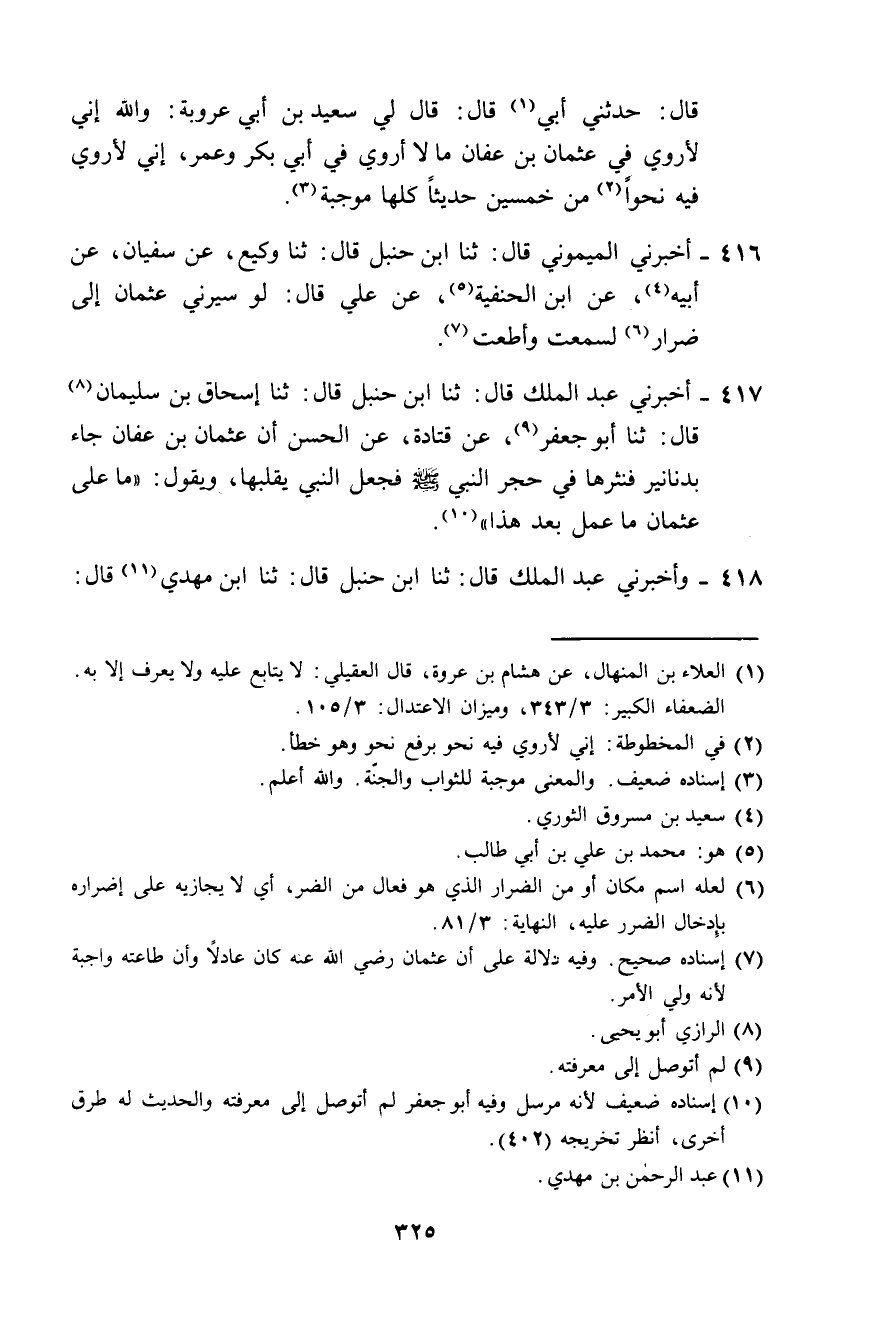 417 - أَخْبَرَنِي عَبْدُ الْمَلِكِ، قَالَ: ثَنَا ابْنُ حَنْبَلٍ، قَالَ: ثَنَا إِسْحَاقُ بْنُ سُلَيْمَانَ، قَالَ: ثَنَا أَبُو جَعْفَرٍ، عَنْ قَتَادَةَ، عَنِ الْحَسَنِ، أَنَّ عُثْمَانَ بْنَ عَفَّانَ جَاءَ بِدَنَانِيرَ فَنَثَرَهَا فِي حِجْرِ النَّبِيِّ صَلَّى اللهُ عَلَيْهِ وَسَلَّمَ، فَجَعَلَ النَّبِيُّ يُقَلِّبُهَا، وَيَقُولُ: «§مَا عَلَى عُثْمَانَ مَا عَمِلَ بَعْدَ هَذَا»