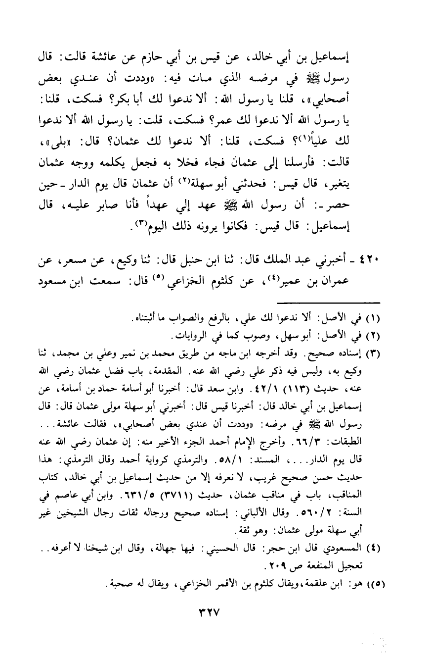 420 - أَخْبَرَنِي عَبْدُ الْمَلِكِ، قَالَ: ثَنَا ابْنُ حَنْبَلٍ، قَالَ: ثَنَا وَكِيعٌ، عَنْ مِسْعَرٍ، عَنْ عِمْرَانَ بْنِ عُمَيْرٍ، عَنْ كُلْثُومٍ الْخُزَاعِيِّ، قَالَ: سَمِعْتُ ابْنَ مَسْعُودٍ -[328]- يَقُولُ: «§مَا أُحِبُّ أَنِّي رَمِيتُ عُثْمَانَ بِسَهْمٍ، وَإِنَّ لِي مِثْلَ أُحُدٍ ذَهَبًا» ، قَالَ مِسْعَرٌ: أُرَاهُ قَالَ: أُرِيدُ قَتْلَهُ