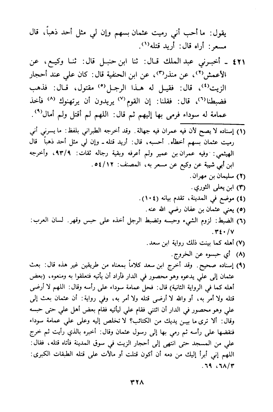 421 - أَخْبَرَنِي عَبْدُ الْمَلِكِ، قَالَ: ثَنَا ابْنُ حَنْبَلٍ، قَالَ: ثَنَا وَكِيعٌ، عَنِ الْأَعْمَشِ، عَنْ مُنْذِرٍ، عَنِ ابْنِ الْحَنَفِيَّةِ، قَالَ: كَانَ عَلِيٌّ عِنْدَ أَحْجَارِ الزَّيْتِ، قَالَ: فَقِيلَ لَهُ: هَذَا الرَّجُلُ مَقْتُولٌ، قَالَ: فَذَهَبَ فَضَبَطَنَا، قَالَ: فَقُلْنَا: إِنَّ الْقَوْمَ يُرِيدُونَ أَنْ يَرْتَهِنُوكَ، فَأَخَذَ عِمَامَةً لَهُ سَوْدَاءَ فَرَمَى بِهَا إِلَيْهِمْ، ثُمَّ قَالَ: «§اللَّهُمَّ لَمْ أَقْتُلْ وَلَمْ أُمَالِ»