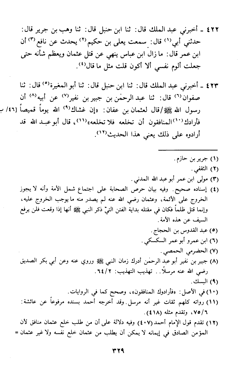 423 - أَخْبَرَنِي عَبْدُ الْمَلِكِ، قَالَ: ثَنَا ابْنُ حَنْبَلٍ، قَالَ: ثَنَا أَبُو الْمُغِيرَةِ، قَالَ: ثَنَا صَفْوَانُ، قَالَ: ثَنَا عَبْدُ الرَّحْمَنِ بْنُ جُبَيْرِ بْنِ نُفَيْرٍ، عَنْ أَبِيهِ: أَنَّ رَسُولَ اللَّهِ صَلَّى اللهُ عَلَيْهِ وَسَلَّمَ قَالَ لِعُثْمَانَ بْنِ عَفَّانَ: «§إِنَّ غَشَاكَ اللَّهُ يَوْمًا قَمِيصًا، فَأَرَادَكَ الْمُنَافِقُونَ أَنْ تَخْلَعَهُ، فَلَا تَخْلَعْهُ» . قَالَ أَبُو عَبْدِ اللَّهِ: قَدْ أَرَادُوهُ عَلَى ذَلِكَ، يَعْنِي هَذَا الْحَدِيثَ