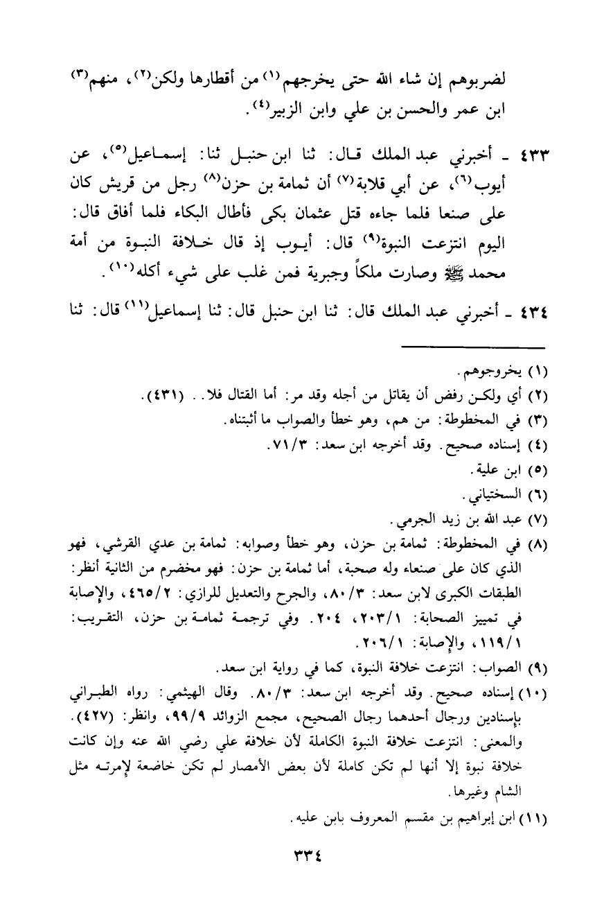 أَخْبَرَنِي عَبْدُ الْمَلِكِ، قَالَ: ثَنَا ابْنُ حَنْبَلٍ، ثَنَا إِسْمَاعِيلُ، عَنْ أَيُّوبَ، عَنْ أَبِي قِلَابَةَ، أَنَّ ثُمَامَةَ بْنَ حَزْنٍ، رَجُلٌ مِنْ قُرَيْشٍ كَانَ عَلَى صَنْعَاءَ، فَلَمَّا جَاءَهُ قَتْلُ عُثْمَانَ بَكَى فَأَطَالَ الْبُكَاءَ، فَلَمَّا أَفَاقَ قَالَ: " §الْيَوْمَ انْتُزِعَتِ النُّبُوَّةُ، قَالَ أَيُّوبُ إِذْ قَالَ: خِلَافَةُ النُّبُوَّةِ مِنْ أُمَّةِ مُحَمَّدٍ صَلَّى اللهُ عَلَيْهِ وَسَلَّمَ، وَصَارَتْ مُلْكًا وَجَبْرِيَّةً، فَمَنْ غَلَبَ عَلَى شَيْءٍ أَكَلَهُ "