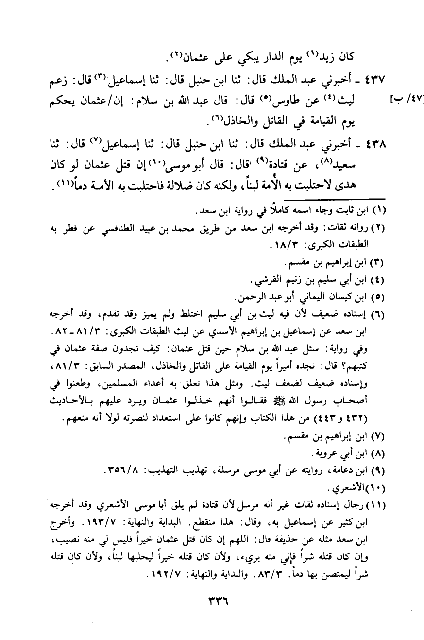 438 - أَخْبَرَنِي عَبْدُ الْمَلِكِ، قَالَ: ثَنَا ابْنُ حَنْبَلٍ، قَالَ: ثَنَا إِسْمَاعِيلُ، قَالَ: ثَنَا سَعِيدٌ، عَنْ قَتَادَةَ، قَالَ: قَالَ أَبُو مُوسَى: «إِنْ §قَتْلَ عُثْمَانَ لَوْ كَانَ هُدًى لَاحْتَلَبَتْ بِهِ الْأَمَةُ لَبَنًا، وَلَكِنَّهُ كَانَ ضَلَالَةً، فَاحْتَلَبَتْ بِهِ الْأَمَةُ دَمًا»
