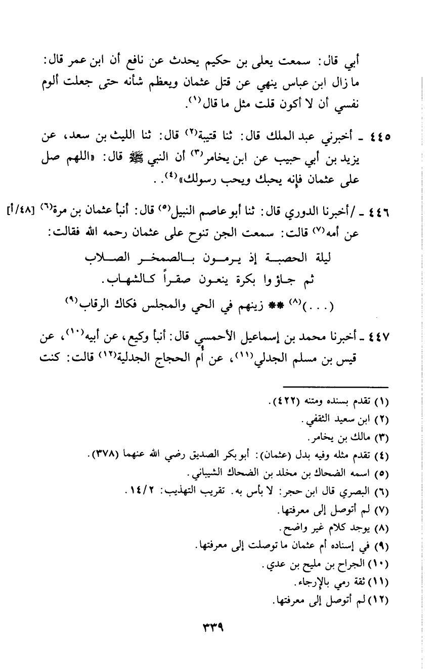446 - أَخْبَرَنَا الدُّورِيُّ، قَالَ: ثَنَا أَبُو عَاصِمٍ النَّبِيلُ، قَالَ: أَنْبَأَ عُثْمَانُ بْنُ مُرَّةَ، عَنْ أُمِّهِ، قَالَتْ: سَمِعْتُ الْجِنَّ تَنُوحُ عَلَى عُثْمَانَ رَحِمَهُ اللَّهُ، فَقَالَتْ: