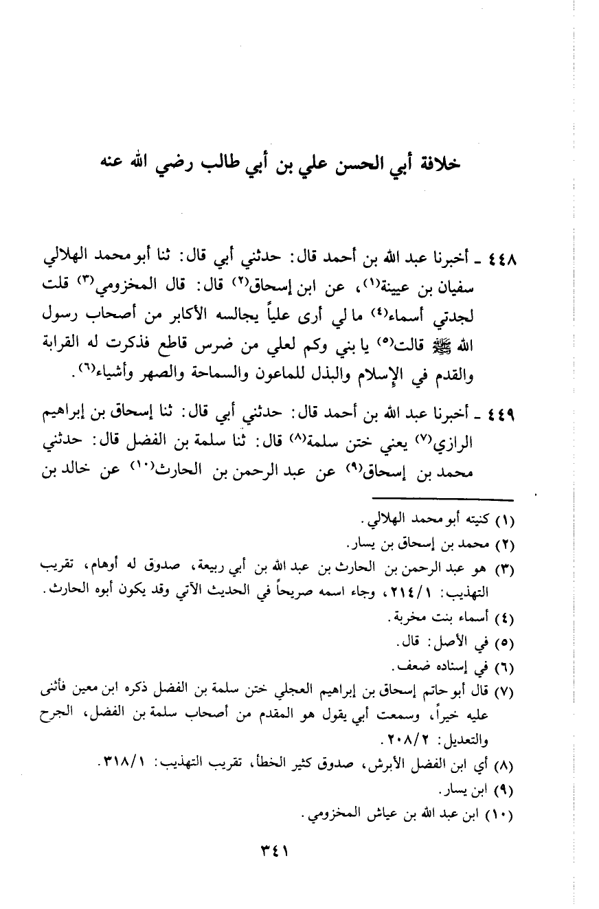 448 - أَخْبَرَنَا عَبْدُ اللَّهِ بْنُ أَحْمَدَ، قَالَ: حَدَّثَنِي أَبِي قَالَ: ثَنَا أَبُو مُحَمَّدٍ الْهِلَالِيُّ سُفْيَانُ بْنُ عُيَيْنَةَ، عَنِ ابْنِ إِسْحَاقَ، قَالَ: قَالَ الْمَخْزُومِيُّ: قُلْتُ لِجَدَّتِي أَسْمَاءَ: مَا لِي أَرَى عَلِيًّا يُجَالِسُهُ الْأَكَابِرُ مِنْ أَصْحَابِ رَسُولِ اللَّهِ صَلَّى اللهُ عَلَيْهِ وَسَلَّمَ؟ قَالَتْ: §يَا بُنَيَّ، وَكَمْ لِعَلِيٍّ مِنْ ضِرْسٍ قَاطِعٍ، فَذَكَرَتْ لَهُ الْقَرَابَةَ، وَالْقِدَمَ فِي الْإِسْلَامِ، وَالْبَذْلَ لِلْمَاعُونَ وَالسَّمَاحَةَ وَالصِّهْرَ وَأَشْيَاءَ "