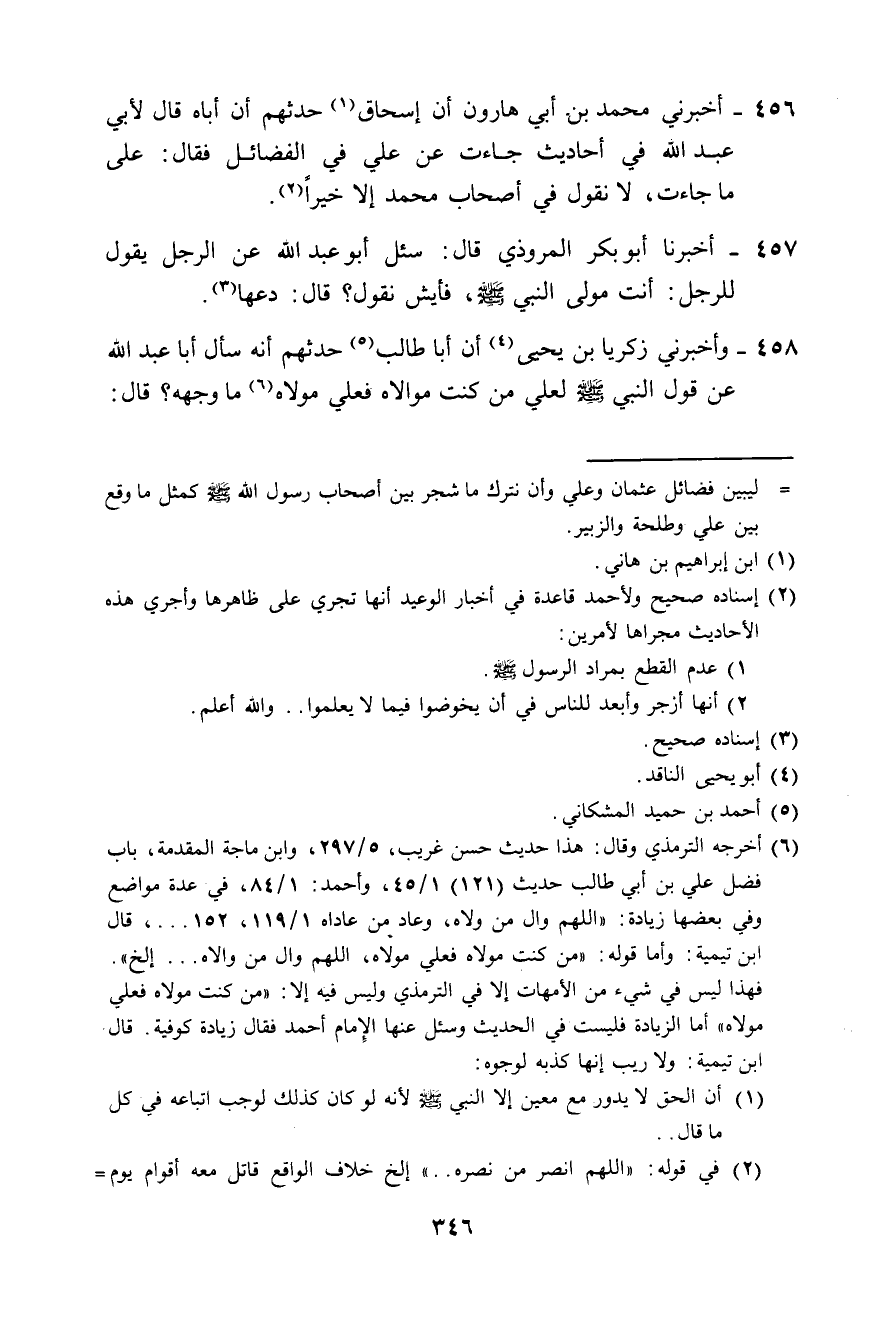 458 - وَأَخْبَرَنِي زَكَرِيَّا بْنُ يَحْيَى، أَنَّ أَبَا طَالِبٍ حَدَّثَهُمْ، أَنَّهُ سَأَلَ أَبَا عَبْدِ اللَّهِ عَنْ قَوْلِ النَّبِيِّ صَلَّى اللهُ عَلَيْهِ وَسَلَّمَ لِعَلِيٍّ: «§مَنْ كُنْتُ مَوْلَاهُ فَعَلِيٌّ مَوْلَاهُ» ، مَا وَجْهُهُ؟ قَالَ -[347]-: «لَا تَكَلَّمْ فِي هَذَا، دَعِ الْحَدِيثَ كَمَا جَاءَ»