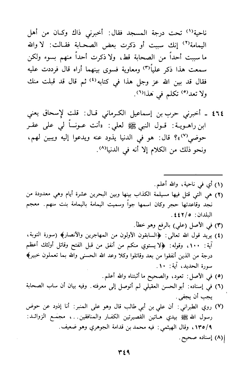 464 - أَخْبَرَنِي حَرْبُ بْنُ إِسْمَاعِيلَ الْكَرْمَانِيُّ، قَالَ: قُلْتُ لِإِسْحَاقَ يَعْنِي ابْنَ رَاهَوَيْهِ: قَوْلُ النَّبِيِّ صَلَّى اللهُ عَلَيْهِ وَسَلَّمَ لِعَلِيٍّ: «§أَنْتَ عَوْنًا لِي عَلَى عَقْرِ حَوْضِي» ، قَالَ: «هُوَ فِي الدُّنْيَا، يَذُودُ عَنْهُ، وَيَدْعُو إِلَيْهِ، وَيُبَيِّنُ لَهُمْ، وَنَحْوَ ذَلِكَ مِنَ الْكَلَامِ، إِلَّا أَنَّهُ فِي الدُّنْيَا»