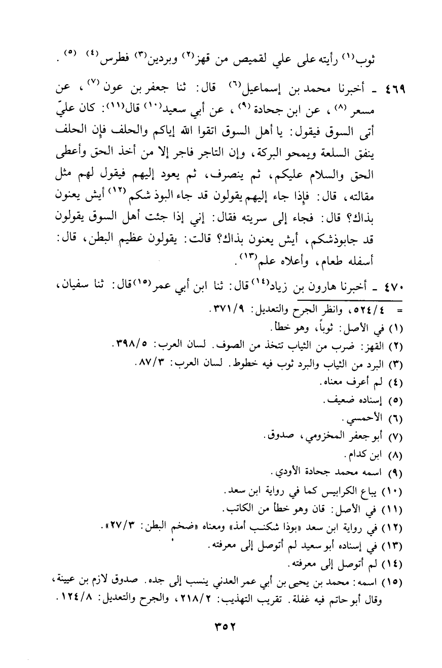 469 - أَخْبَرَنَا مُحَمَّدُ بْنُ إِسْمَاعِيلَ، قَالَ: ثَنَا جَعْفَرُ بْنُ عَوْنٍ، عَنْ مِسْعَرٍ، عَنِ ابْنِ جُحَادَةَ، عَنْ أَبِي سَعِيدٍ، قَالَ: كَانَ عَلِيٌّ إِذَا أَتَى السُّوقَ فَيَقُولُ: «يَا أَهْلَ السُّوقِ، §اتَّقُوا اللَّهَ , إِيَّاكُمْ وَالْحَلِفَ، فَإِنَّ الْحَلِفَ يُنَفِّقُ السِّلْعَةَ وَيَمْحُو الْبَرَكَةَ، وَإِنَّ التَّاجِرَ فَاجِرٌ، إِلَّا مَنْ أَخَذَ الْحَقَّ، وَأَعْطَى الْحَقَّ، وَالسَّلَامُ عَلَيْكُمْ» ، ثُمَّ يَنْصَرِفُ، ثُمَّ يَعُودُ إِلَيْهِمْ فَيَقُولُ لَهُمْ مِثْلَ مَقَالَتِهِ، قَالَ: فَإِذَا جَاءَ إِلَيْهِمْ يَقُولُونَ: قَدْ جَاءَ البوذشكم، أَيْشِ يَعْنُونَ بِذَاكَ؟ قَالَ: فَجَاءَ إِلَى سُرِّيَّتِهِ فَقَالَ: إِنِّي إِذَا جِئْتُ أَهْلَ السُّوقِ يَقُولُونَ: قَدْ جَاءَ بوذشكم أَيْشِ يَعْنُونَ بِذَاكَ؟ قَالَتْ: يَقُولُونَ: عَظِيمُ الْبَطْنِ، قَالَ: أَسْفَلَهُ طَعَامٌ، وَأَعْلَاهُ عِلْمٌ "