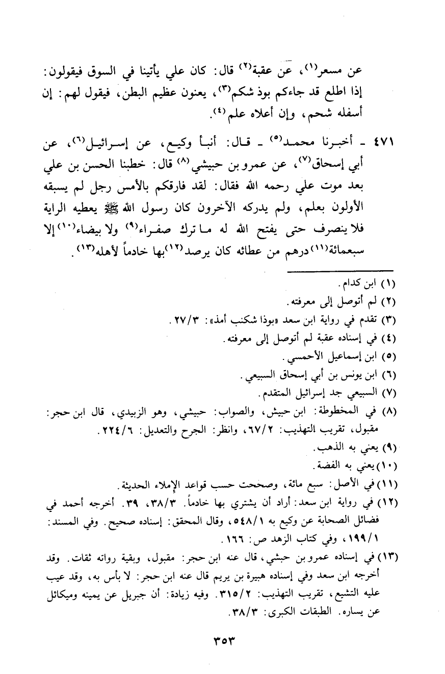 471 - أَخْبَرَنَا مُحَمَّدٌ، قَالَ: أَنْبَأَ وَكِيعٌ، عَنْ إِسْرَائِيلَ، عَنْ أَبِي إِسْحَاقَ، عَنْ عَمْرِو بْنِ حُبَيْشِيٍّ، قَالَ: خَطَبَنَا الْحَسَنُ بْنُ عَلِيٍّ بَعْدَ مَوْتِ عَلِيٍّ رَحِمَهُ اللَّهُ فَقَالَ: «لَقَدْ §فَارَقَكُمْ بِالْأَمْسِ رَجُلٌ لَمْ يَسْبِقْهُ الْأَوَّلُونَ بِعِلْمٍ، وَلَمْ يُدْرِكْهُ الْآخَرُونَ، كَانَ رَسُولُ اللَّهِ صَلَّى اللهُ عَلَيْهِ وَسَلَّمَ يُعْطِيهُ الرَّايَةَ، فَلَا يَنْصَرِفُ حَتَّى يَفْتَحَ اللَّهُ لَهُ، مَا تَرَكَ صَفْرَاءَ وَلَا بَيْضَاءَ، إِلَّا سَبْعَمِائَةِ دِرْهَمٍ مِنْ عَطَائِهِ، كَانَ يَرْصُدُ بِهَا خَادِمًا لِأَهْلِهِ»