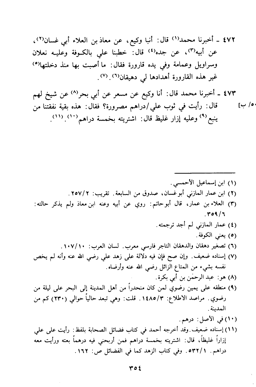 473 - أَخْبَرَنَا مُحَمَّدَ، قَالَ: أَنَا وَكِيعٌ، عَنْ مِسْعَرٍ، عَنْ أَبِي بَحْرٍ، عَنْ شَيْخٍ لَهُمْ، قَالَ: رَأَيْتُ فِي ثَوْبِ عَلِيٍّ دَارِهِمَ مَصْرُورَةً، فَقَالَ: " §هَذِهِ بَقِيَّةُ نَفَقَتِنَا مِنْ يَنْبُعَ، وَعَلَيْهِ إِزَارٌ غَلِيظٌ، قَالَ: اشْتَرَيْتُهُ بِخَمْسَةِ دَرَاهِمَ "