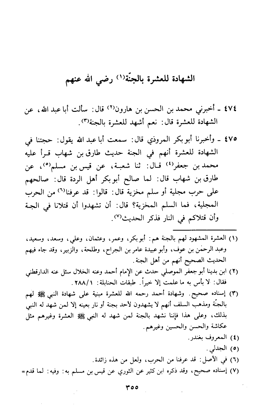 475 - وَأَخْبَرَنَا أَبُو بَكْرٍ الْمَرُّوذِيُّ، قَالَ: سَمِعْتُ أَبَا عَبْدِ اللَّهِ، يَقُولُ: حُجَّتُنَا فِي الشَّهَادَةُ لِلْعَشَرَةِ أَنَّهُمْ فِي الْجَنَّةِ حَدِيثُ طَارِقِ بْنِ شِهَابٍ: قَرَأَ عَلَيْهِ مُحَمَّدُ بْنُ جَعْفَرٍ قَالَ: ثَنَا شُعْبَةُ، عَنْ قَيْسِ بْنِ مُسْلِمٍ، عَنْ طَارِقِ بْنِ شِهَابٍ قَالَ: لَمَّا صَالَحَ أَبُو بَكْرٍ أَهْلَ الرِّدَّةِ قَالَ: صَالَحَهُمْ عَلَى حَرْبٍ مُجْلِيَةٍ أَوْ سِلْمٍ مُخْزِيَةٍ. قَالَ: قَالُوا: قَدْ عَرَفْنَا الْحَرْبَ الْمُجْلِيَةَ، فَمَا السِّلْمَ الْمُخْزِيَةَ؟ قَالَ: «أَنْ §تَشْهَدُوا أَنَّ قَتْلَانَا فِي الْجَنَّةِ وَأَنَّ قَتْلَاكُمْ فِي النَّارِ» ، فَذَكَرَ الْحَدِيثَ