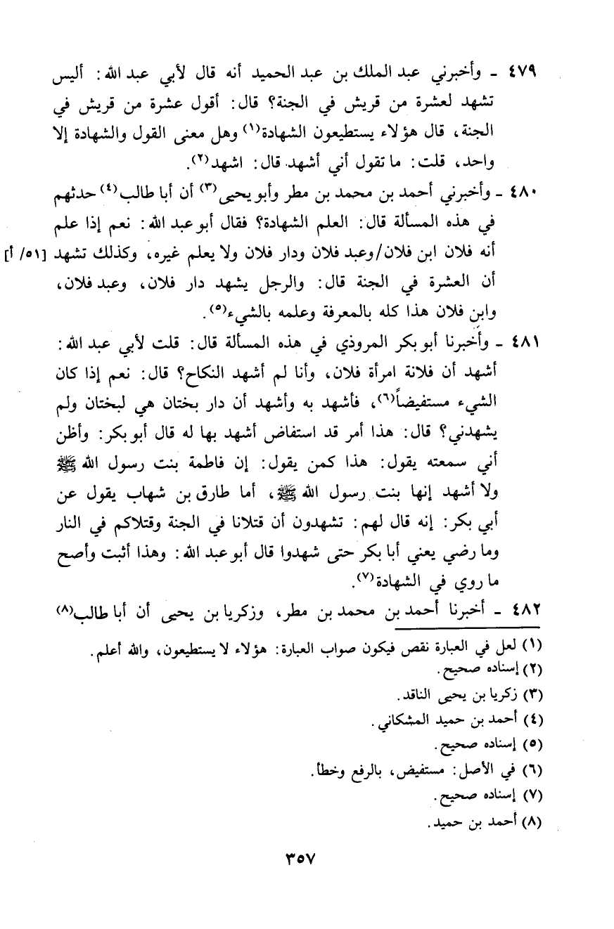 479 - وَأَخْبَرَنِي عَبْدُ الْمَلِكِ بْنُ عَبْدِ الْحَمِيدِ، أَنَّهُ قَالَ لِأَبِي عَبْدِ اللَّهِ: أَلَيْسَ تَشْهَدُ لِعَشَرَةٍ مِنْ قُرَيْشٍ فِي الْجَنَّةِ؟ قَالَ: " أَقُولُ: §عَشَرَةٌ مِنْ قُرَيْشٍ فِي الْجَنَّةِ، قَالَ: هَؤُلَاءِ يَسْتَطِيعُونَ الشَّهَادَةَ , وَهَلْ مَعْنَى الْقَوْلِ وَالشَّهَادَةِ إِلَّا وَاحِدٌ، قُلْتُ: مَا تَقُولُ أَنِّي أَشْهَدُ؟ قَالَ: اشْهَدْ "