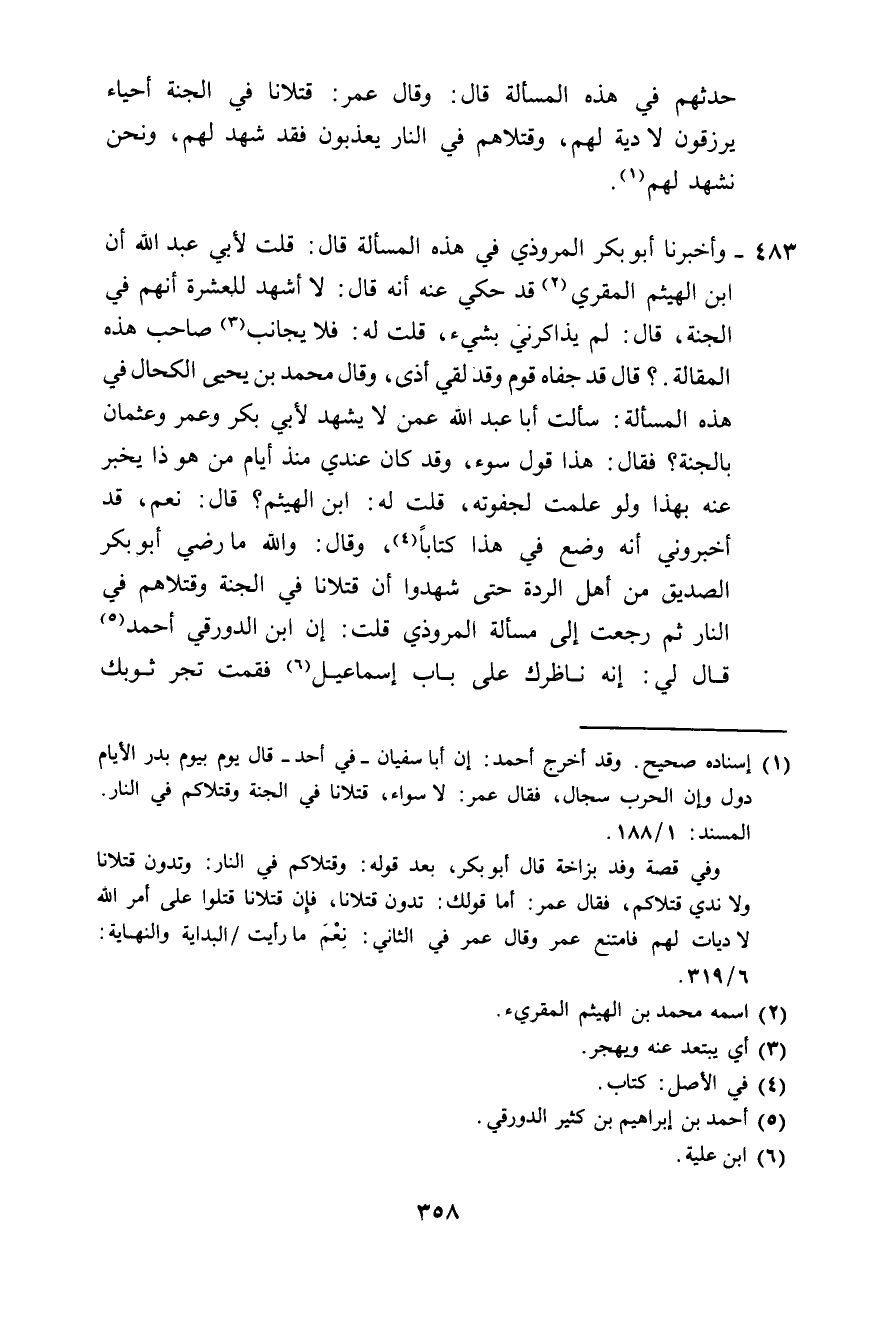 483 - وَأَخْبَرَنَا أَبُو بَكْرٍ الْمَرُّوذِيُّ، فِي هَذِهِ الْمَسْأَلَةِ قَالَ: قُلْتُ لِأَبِي عَبْدِ اللَّهِ: إِنَّ ابْنَ الْهَيْثَمِ الْمُقْرِئَ قَدْ حُكِيَ عَنْهُ أَنَّهُ قَالَ: لَا أَشْهَدُ لِلْعَشَرَةِ أَنَّهُمْ فِي الْجَنَّةِ، قَالَ: لَمْ يُذَاكِرْنِي بِشَيْءٍ، قُلْتُ لَهُ: فَلَا يُجَانَبُ صَاحِبُ هَذِهِ الْمَقَالَةِ؟ قَالَ: قَدْ جَفَاهُ قَوْمٌ , وَقَدْ لَقِيَ أَذًى. وَقَالَ مُحَمَّدُ بْنُ يَحْيَى الْكَحَّالُ فِي هَذِهِ الْمَسْأَلَةِ: سَأَلْتُ أَبَا عَبْدِ اللَّهِ عَمَّنْ لَا يَشْهَدُ لِأَبِي بَكْرٍ وَعُمَرَ وَعُثْمَانَ بِالْجَنَّةِ , فَقَالَ: هَذَا قَوْلُ سَوْءٍ، وَقَدْ كَانَ عِنْدِي مُنْذُ أَيَّامٍ مَنْ هُوَ ذَا يُخْبِرُ عَنْهُ بِهَذَا , وَلَوْ عَلِمْتُ لَجَفَوْتُهُ، قُلْتُ لَهُ: ابْنُ الْهَيْثَمِ؟ قَالَ: نَعَمْ، قَدْ أَخْبِرُونِي أَنَّهُ وَضَعَ فِي هَذَا كِتَابًا، وَقَالَ: «وَاللَّهِ §مَا رَضِيَ أَبُو بَكْرٍ الصِّدِّيقُ مِنْ أَهْلِ الرِّدَّةِ حَتَّى شَهِدُوا أَنَّ قَتْلَانَا فِي الْجَنَّةِ، وَقَتْلَاهُمْ فِي النَّارِ» ، ثُمَّ رَجَعْتُ إِلَى مَسْأَلَةِ الْمَرُّوذِيِّ , قُلْتُ: إِنَّ ابْنَ الدَّوْرَقِيِّ أَحْمَدَ قَالَ لِي: إِنَّهُ نَاظَرَكَ عَلَى بَابِ إِسْمَاعِيلَ فَقُمْتَ تَجُرُّ ثَوْبَكَ -[359]- مُغْضَبًا؟ قَالَ: لَا أَدْرِي "