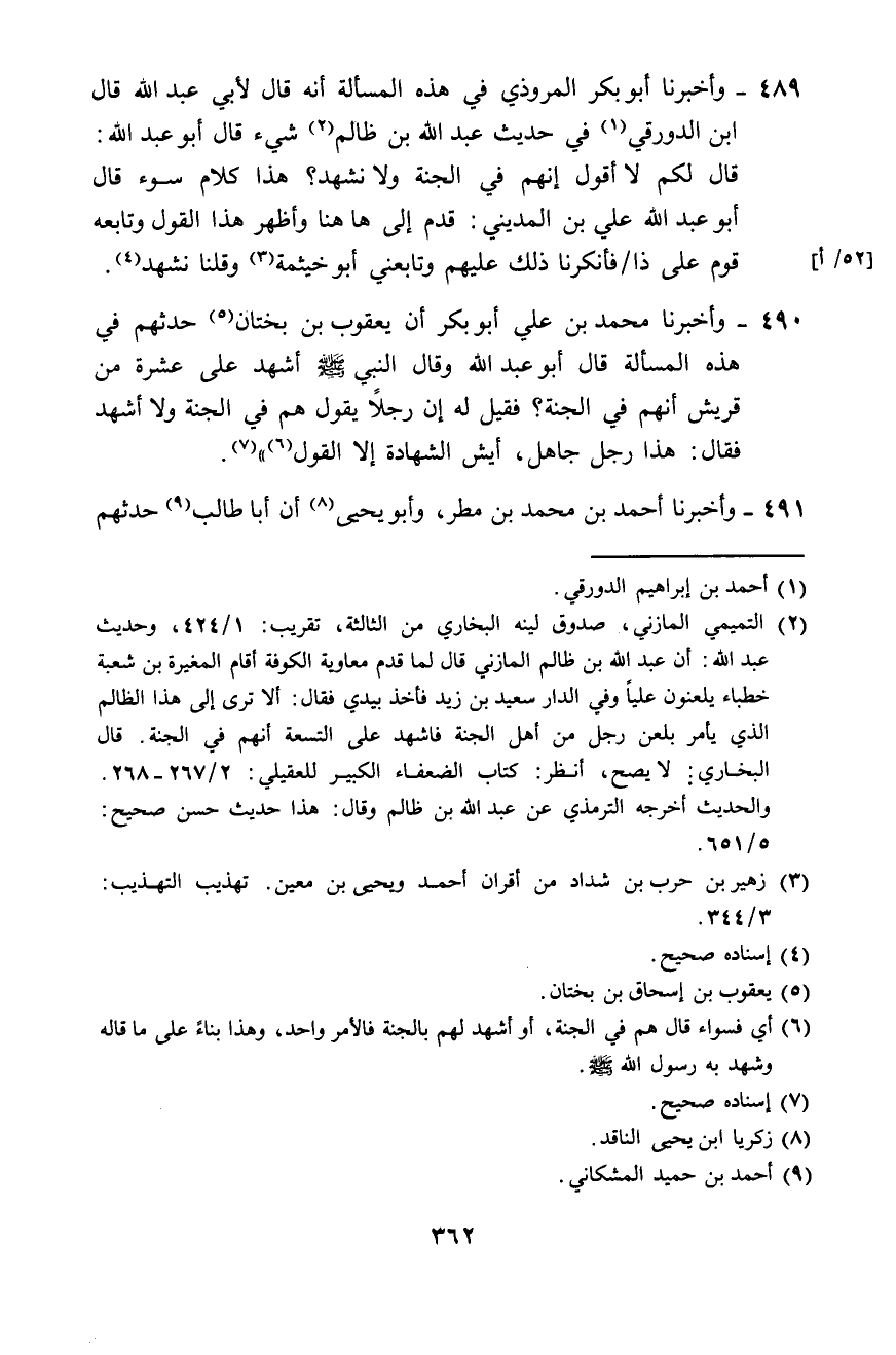 489 - وَأَخْبَرَنَا أَبُو بَكْرٍ الْمَرُّوذِيُّ، فِي هَذِهِ الْمَسْأَلَةِ أَنَّهُ قَالَ لِأَبِي عَبْدِ اللَّهِ: قَالَ ابْنُ الدَّوْرَقِيِّ فِي حَدِيثِ عَبْدِ اللَّهِ بْنِ ظَالِمٍ شَيْءٌ , قَالَ أَبُو عَبْدِ اللَّهِ: §قَالَ لَكُمْ: لَا أَقُولُ إِنَّهُمْ فِي الْجَنَّةِ وَلَا نَشْهَدُ؟ هَذَا كَلَامُ سَوْءٍ، قَالَ أَبُو عَبْدِ اللَّهِ: عَلِيُّ بْنُ الْمَدِينِيِّ قَدِمَ إِلَى هَا هُنَا، وَأَظْهَرَ هَذَا الْقَوْلَ، وَتَابَعَهُ قَوْمٌ عَلَى ذَا , فَأَنْكَرْنَا ذَلِكَ عَلَيْهِمْ , وَتَابَعَنِي أَبُو خَيْثَمَةَ , وَقُلْنَا: نَشْهَدُ "